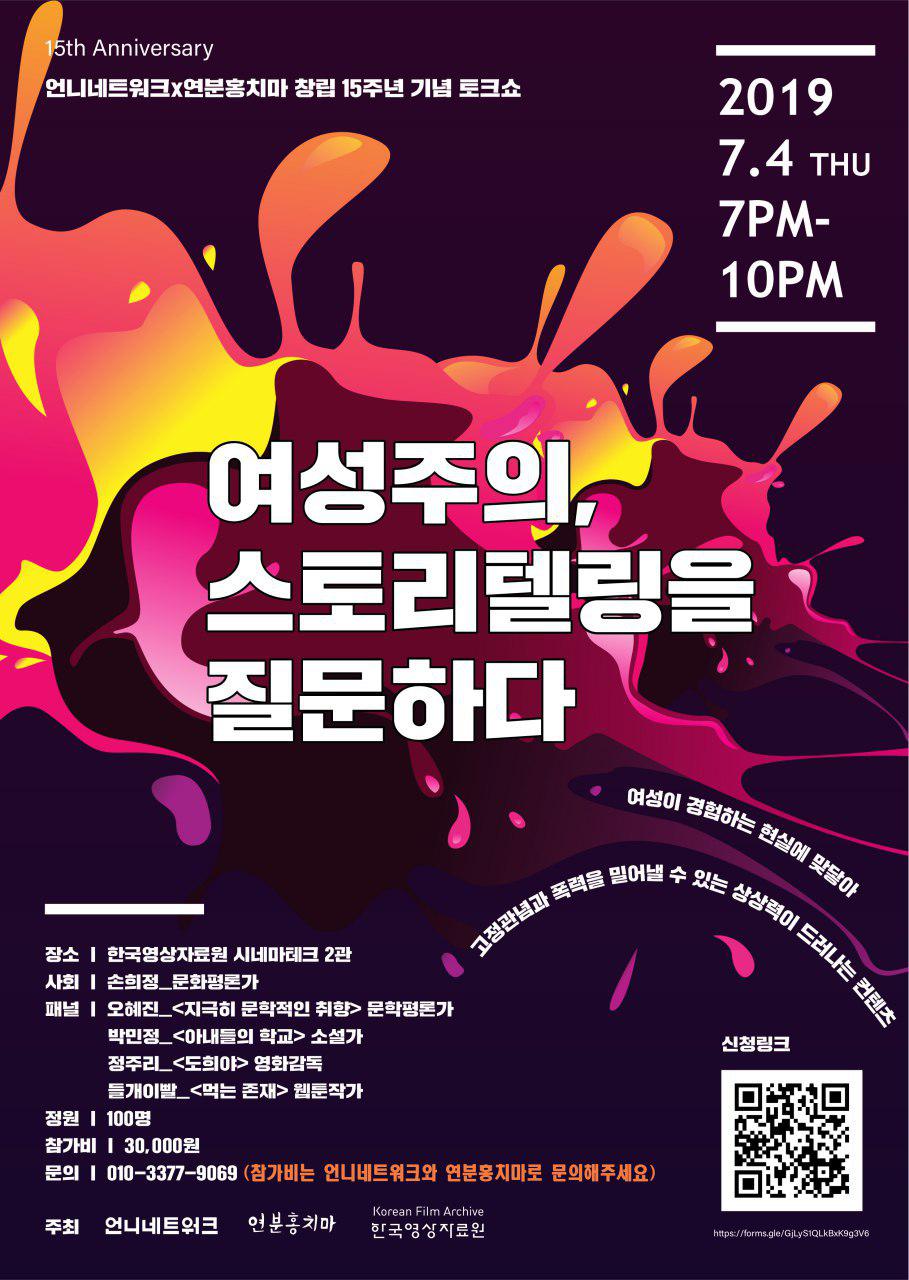 그런데 ‘여성 서사’는 무엇일까? 여성을 주연으로 삼거나 여성 창작자가 만든 작품이 페미니스트로서 실망스럽다면 어떻게 해야 할까? 특정한 요소들을 갖춘 작품만이 여성주의적으로 의미 있을까? 지금의 지지가 창작자들에게 실질적으로 도움이 되고 있을까? 지난 7월 3일 한국영상자료원에서 열린 <여성주의 스토리텔링을 질문하다> 토크쇼는 현재의 ‘여성 서사’ 논쟁에 담긴 복합적인 문제들을 짚어볼 수 있는 자리였다. 여성주의 문화운동을 지속해온 언니네트워크와 성적소수문화인권연대로 ‘다른 서사’를 선보여 온 연분홍치마의 고민이 담긴 기획이었다. 100석 규모의 극장을 가득 메운 페미니스트들도 소비자로서, 또 창작자로서 자리에 함께했다.