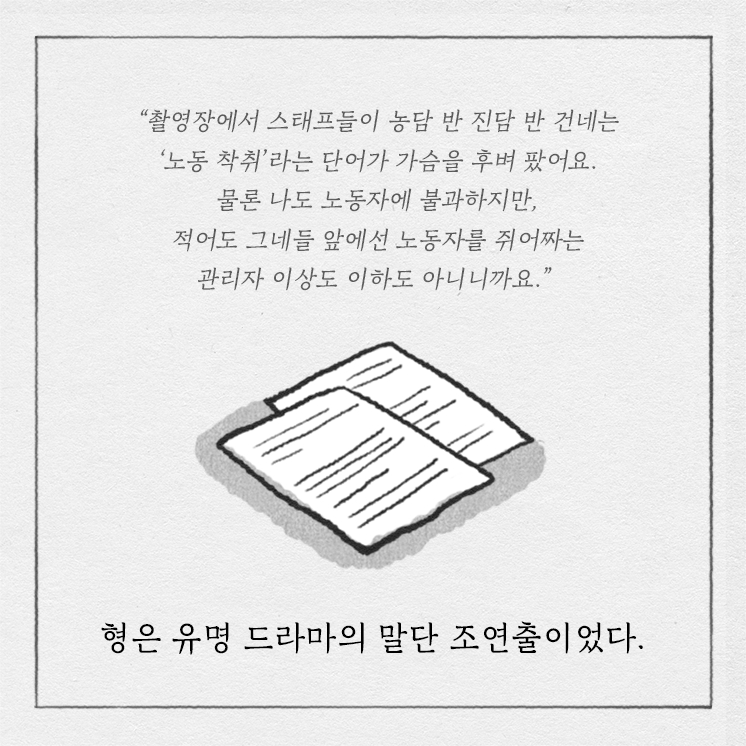 "드라마라는 거대 목표는 노동자들에게 수습할 시간을 주지 않고 주위 사람들을 챙길 수 있는 여유를 주지 않는다. 사실 한 발짝 떠나고 보면 드라마는 인생이 아니고 하나의 프로젝트인데, 하는 와중에는 삶이 보이지 않는다. 마치 거대한 코끼리가 내 앞을 가로막고 있는 기분이다."