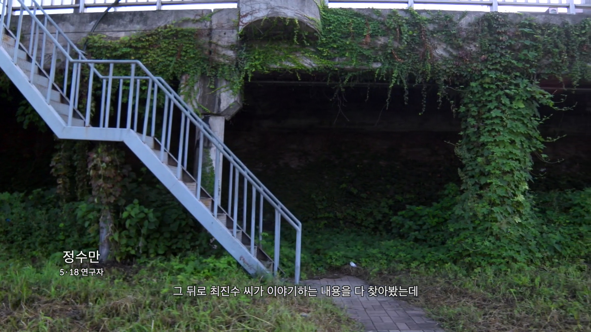 그런데 증언의 막바지에 도달하고도 <김군>은 그곳이 종착지라는 확신을 주지 않는다. 김군의 행방에 대한 사실관계를 주장하는 증언이 아니라, 그날의 트라우마를 이야기하는 주관적 진술이 마지막 증언의 자리를 채우기 때문이다. 증언 시퀀스들은 인물에 따라 순차적으로 배열되고, 바톤터치를 하듯 초점을 수차례 옮겨간다. 증언들 사이에 정립된 수평적 위계는 종합된 입장의 수렴을 어렵게 만든다. 그러나 영화가 관점을 은밀하게 피력하는 구간이 있다. 김군이 사라진 넝마주이라는 주옥의 주장과 그의 죽음을 목격했다는 최진수의 주장은 김군으로 추정되는 인물들과 주변인의 진술 사이에 자리하고 있다. 그러나 두 증언 시퀀스 간의 근본적 거리는 결코 멀지 않다. 주옥의 증언은 김군이 거주했다는 다리 밑 풍경과 결합하며 이미지와 사운드의 공명을 만들어낸다. 최진수의 증언을 기반으로 사건을 조사 중인 5・18 연구자의 보이스오버 역시 기시감이 드는 풍경 쇼트와 결합한다. 그런데 이 쇼트에서 이미지의 역할은 음성을 뒷받침하는 것이 아니다. 연구자가 김군이 죽은 장소를 가정집 마당이라 지목하는 동안 카메라는 이전의 다리 밑 풍경을 비추기 때문이다. 이때 서로 만난 적 없는 두 시퀀스는 같은 장소의 풍경 쇼트를 통해 느슨하게 연결된다. 사건 이후 시체가 발견되지 않았다는 연구자의 음성이 넝마주이가 사라졌다는 주옥의 진술과 가상적으로 포개어지는 것이다.