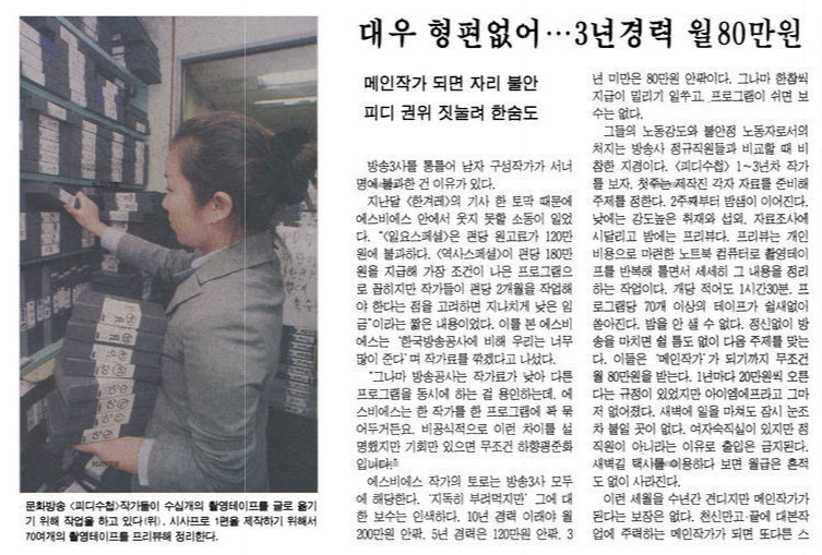 한 프로그램을 완성시키기 위해 피디는 촬영과 편집을 담당하고 작가는 구성과 글을 담당하는 것처럼 보이지만 구체적인 롤을 명확하게 나눌 수 없는 것이 현실이다. 실질적으로 방송을 제작하는 데에 피디 못지않게, 어쩌면 더 많은 것들을 방송작가가 떠맡아왔기 때문이다. 하지만 고용 형태에는 엄청난 차이가 있다. 방송사의 피디들은 회사에 소속된 정규직이고, 요즘에는 다수의 프리랜서 피디들도 계약을 하고 일을 하는 경우가 많다. 하지만 작가가 방송사나 외주제작사와 계약을 하고 일하는 일은 거의 없다. 이는 비슷한 노동인데 작은 차이를 둬서 한쪽에게만 낮은 임금과 불안정한 노동을 정당화하는, 사업장에서 동일노동 동일임금을 방해하는 대표적인 방법이며 주로 한 사업장 안에서 여성과 남성의 임금 차이를 둘 때 활용된다. 이는 근본적이고 구조적인 차별이다. 이런 방식의 명백한 성차별이 1980년대부터 2019년 대한민국의 방송 콘텐츠가 세계를 주름잡는 지금까지 공고히 이어져 온 것이다.