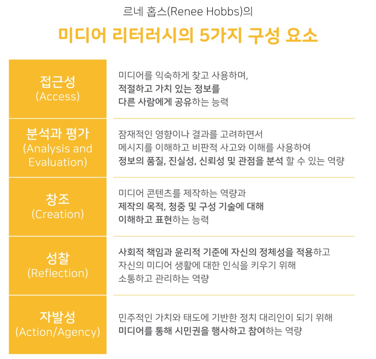 - 르네 홉스(Renee Hobbs)의 '미디어 리터러시의 5가지 구성요소