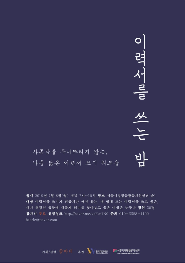 짱아 저도 덧붙이면, 저는 줌마네에 들어오기 전 여성단체에서 일하고 있었는데, 삶이 행복하지 않았었어요. 그때 줌마네 교육을 받았는데, 다른 이유 때문이 아니라 다른 직업을 가지려고 생각했기 때문이었어요. 제가 들었던 <글쓰기로 돈 버는 힘 기르기>는 기자수업에 가까운 타이트한 프로그램이었어요. 줌마네는 그렇게, 사회생활에 복귀하기 위해 문화센터에 가는 게 아니라 여자들끼리 모여서 힘을 얻고 나에게 뭔가를 장착하려는 사람들이 모이는 곳이었어요.
