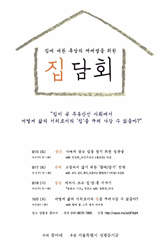 사실 대학이나 정치조직에 속해 있는 이에겐 여성주의자 공동체를 찾는 것이 그리 어려운 일이 아닐 것이다. 하지만 직장생활, 분야가 나뉘어 있는 활동영역, 고시준비 등 각자의 생활에 매진하는 나와 친구들은 각자의 주거와 생활을 지지할 기반을 찾기 어려웠다. 그런데 뒤늦게 줌마네를 통해 만난 사람들은 이미 삶의 단단한 기반을 가지고 있는 것처럼 느껴졌다. 그래서 궁금해졌다.