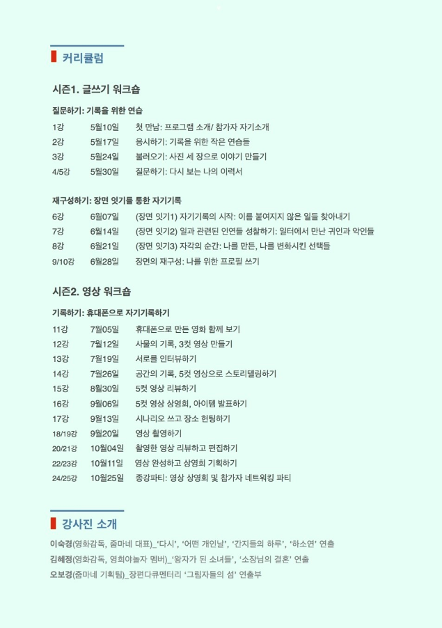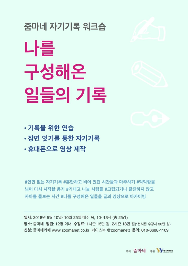 | 여성들의 자립과 예술적 성장을 돕는 곳, 줌마네 (since 2001) 줌마네 기획팀 소개 오보 “줌마네 기획팀에 들어온 지 3년 차입니다. 기획회의 때마다 회의록을 작성하고요. 솔직하게는 아직 줌마네를 파악하고 있습니다. <주간 오보>라는 일주일에 한 번씩 글을 쓰는 프로젝트를 하며 책을 낼 계획을 가지고 있습니다.” 루후나 “줌마네와는 인터뷰 글쓰기 강좌로 만났고 2016년 기획팀에 합류, 올해로 4년 차네요. 이것저것 여러 가지(?) 일들을 하고 있습니다.” 짱아 2001년 ‘글쓰기로 돈 버는 힘 기르기’ 1기로 연을 맺고 기획팀은 7년 전에 들어왔습니다. 역할은 조금씩 변하고 있지만 사람들에게 전화해서 섭외하고, 옛날 멤버들을 기억하고 연락하는 일은 계속하고 있는 것 같아요.” 하리 “영상 만드는 일을 하면서 오소리와의 인연으로 줌마네에서 2013년 ‘두 번째 영화를 위한 제작 워크숍’을 진행했습니다. 지금까지도 기획하고 진행하는 일을 하고 있습니다.” 오소리 “줌마네를 만든 사람입니다. 영화를 만드는 게 제 일입니다. 줌마네에서 함께 기획하고, 줌마네라는 플랫폼을 계속 흐르게 하는 역할을 합니다.” |