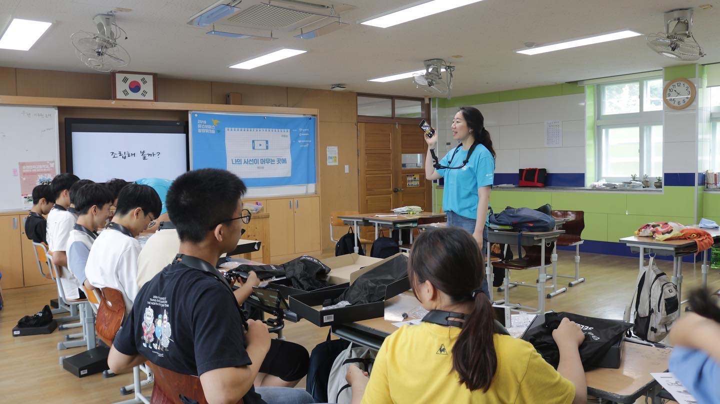 가장 최근에 진행한 유스보이스 프로젝트가 <나의 시선이 머무는 곳에>입니다. 이 프로그램은 올해 여름과 가을, 두 번에 걸쳐 진행되었는데 IT기기와 미디어가 함께 어우러져 본인이 좋아하는 것을 알아가며 그것을 영상으로 기록하고 공유하는 교육입니다. 제가 이 교육에서 사용한 도구는 ‘셀디’라는 것인데, 이 기기는 1인칭 시점 캠을 위한 웨어러블 디바이스입니다. 고프로나 스마트폰을 장착하여 1인칭 영상을 효율적으로 촬영할 수 있도록 고안된 도구라 이번 프로젝트와 어울릴 것이라 판단했습니다. 촬영과 편집 도구는 아이들에게 친숙한 스마트폰을 이용했습니다. 총 12시간으로 구성된 이 교육은 중학생과 고등학생들에게 적용할 수 있습니다. 이 프로젝트는 지난여름 중학교 3학년 아이들을 대상으로 처음 진행한 후, 이번 가을에 몽골 아이들을 대상으로 두 번째 교육을 진행하였습니다.