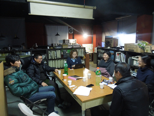 명순: 딱히 모여서 막 뭘 한다는 건 없다. 촬영스케줄도 각자 다르고, 지방 내려가 있는 경우도 많아서, 사무실 나오는 날이 들쭉날쭉하다. 일정을 서로 조정하기는 하지만, 몇 주에 한 번씩 날짜 맞춰 회의하는 것 외에는 글쎄. 평상시에 사무실 들어오면 각자 자리로 가는 거다. 아침에 인사하고 자기 자리에서 작업하다가, 밥 때는 같이 먹고. 일부러 그런 게 아니라 서로 하고 있는 작업이 다르니까. 2주에 한번 회의할 때는 개인보고를 해서 각자의 작업에 대한 업데이트를 한다. 이야기는 일상적으로 하지만 사실 개인 작업 진행상황까지는 잘 모르니까. 제가 금요일에 한다는 것처럼 가편집본 시사를 하기도 하고, 작업마다 다르다. 가편 보고 평 해주면 다음 작업 방향에 대해서 이야기도 하고. 그렇게 사무실의 의견도 같이 들어가는 그런 시스템이다.
