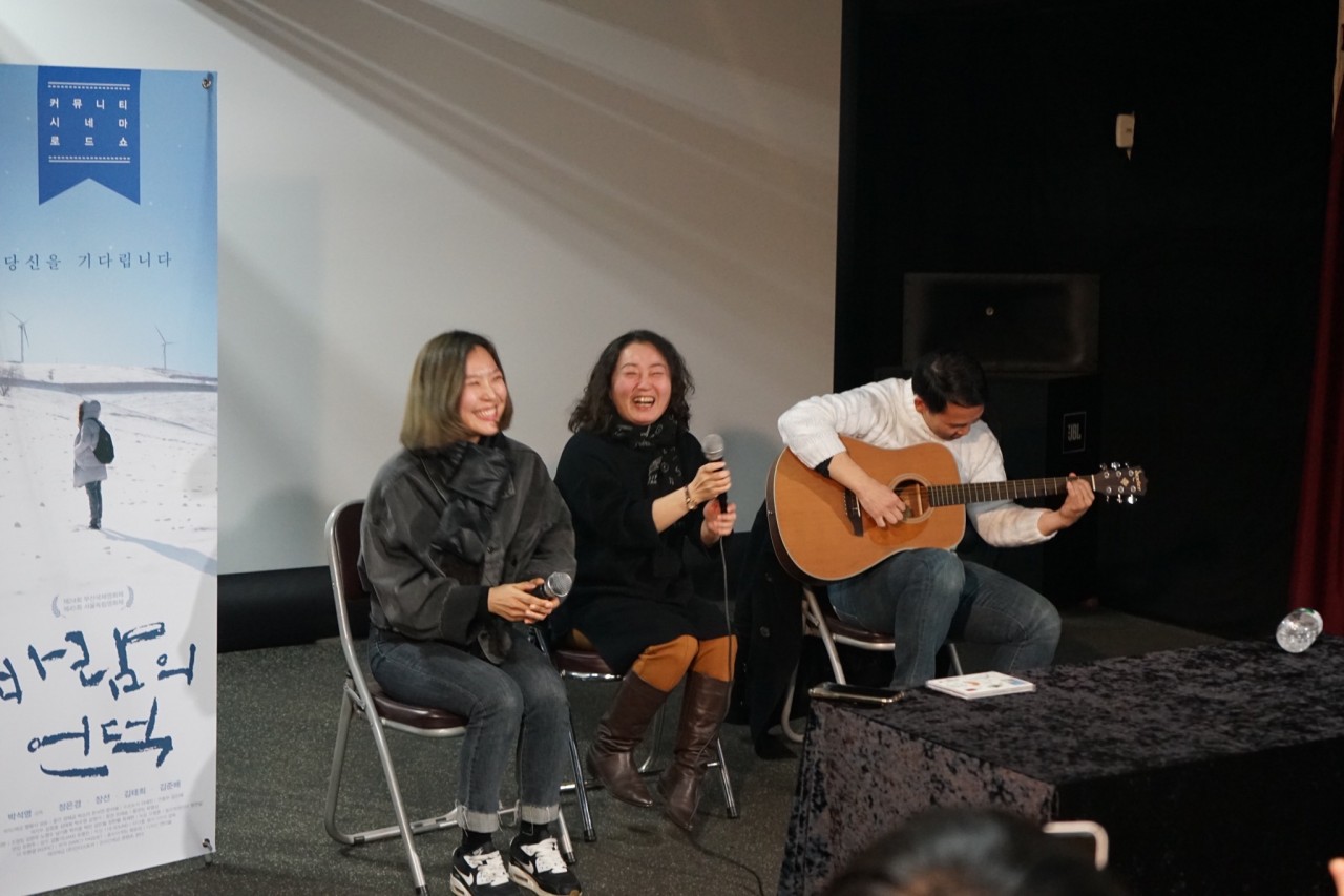 이러한 커뮤니티 주도적인 상영회의 가장 커다란 특징은 영화가 다양한 관점으로 이해된다는 것입니다. 예를 들면 진주시민미디어센터의 상영에서는 진행 주체인 페미시네의 여성주의적인 시선을 만날 수 있었고, 인디하우스와 함께한 강릉 신영극장에서는 비평모임이 영화를 미리 보고 써주신 평론들을 작은 책자로 만들어 주셔서 좀 더 깊이 영화읽기를 해볼 수 있었습니다. 서울의 KU 시네마에서 함께 한 낫띵벗필름은 <바람의 언덕> 배우분들의 이전 단편영화를 모아 함께 상영해 주셨으니. 한 상영 한 상영이 늘 새로운 질문과 다른 이해의 과정이 되었습니다. 정말 기쁜 것은 이렇게 각 커뮤니티의 애정과 깊이를 마주하는 대면 속에, 영화를 만든 저희들도 매번 새로워지고 있다는 것입니다.