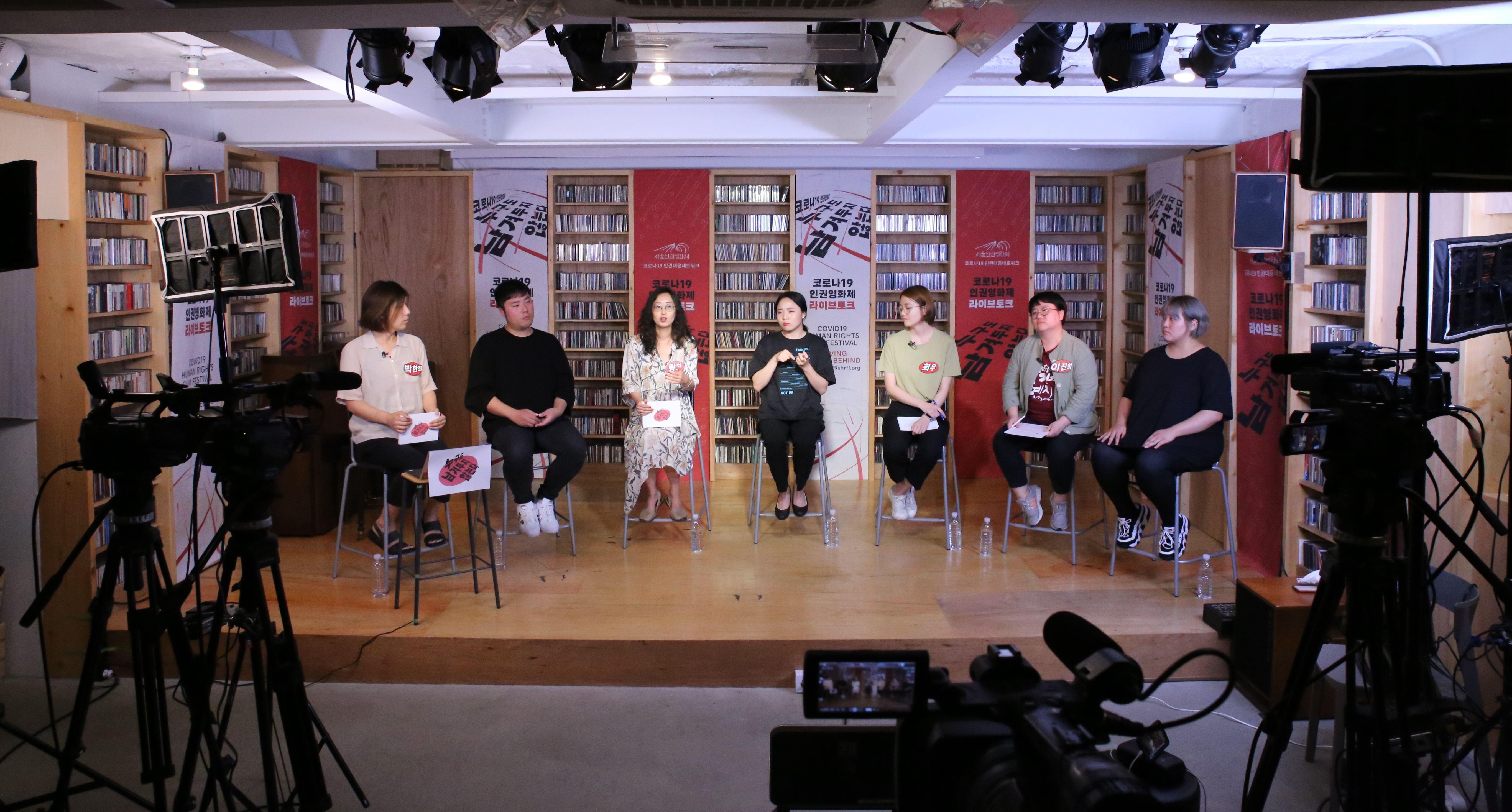 ▲ 무대 위에서 <코로나19 인권영화제: 누구도 남겨두지 않는다> 라이브토크 1부가 진행되고 있다. 왼쪽부터 박한희 활동가, 김보석 수어통역사(한국농인LGBT), 랑희 활동가, 백수진 수어통역사, 희우 활동가, 진희 활동가, 남진영 수어통역사가 앉아있다.
