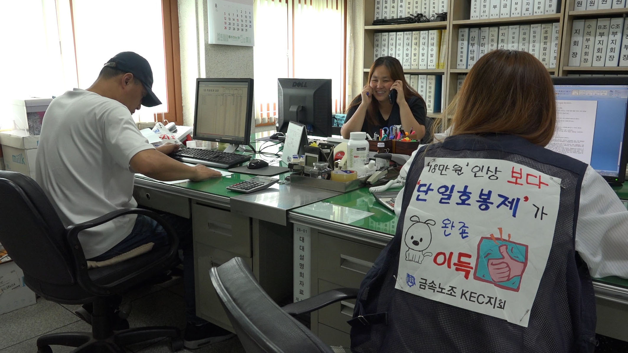 이렇게 노조의 밝은(?) 모습에 주목한 결과 이 영화는 노동조합을 미화한 것 아니냐는 이야기를 듣기도 하는 것 같지만, 내가 느낄 때 영화는 오히려 노동조합이 처한 현실을 그대로 보여주는 편이다. 소수노조인 KEC지회는 임단협 체결을 위해 8년 만에 제2노조와의 교섭창구 단일화에 참여하기로 결정하는데, 이를 논의하는 노동조합의 회의에서 배태선 교육국장에게 한 간부가 질문을 한다. 현장 조합원들이 최종적으로 임단협 안을 결정하는 투표에 참여할 수 있는 건지 궁금해한다고. 배태선 국장은 교섭대표 노조가 갖는 공정대표의무가 있음을 들어 승산이 있음을 설명하지만, 영화 말미에서 결국 교섭대표 노조인 제2노조는 전체 조합원들이 투표를 통해 부결까지 시킨 안으로 회사와 협상한다. 영화는 누구보다 열심히 노력했지만 교섭권이 없는 소수노조로서 결정적인 힘을 발휘할 수 없었다는 결과를 감추지 않으면서 인터뷰나 내레이션을 통해 상황을 평가하지도 않는다.