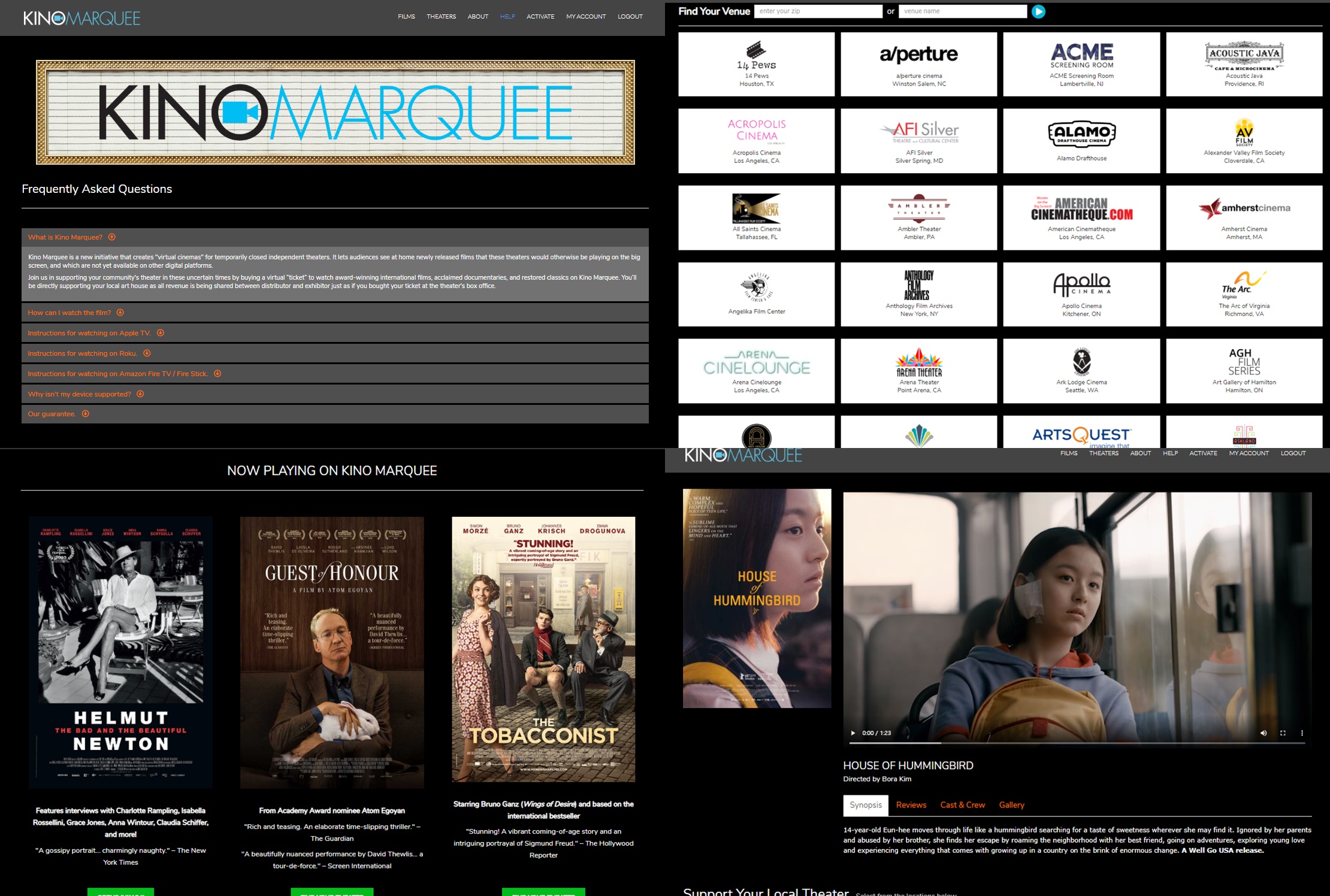 키노 마퀴(*주1)는 배급사인 키노 로버가 코로나 19로 인해 문을 닫은 미국 내의 독립극장을 위해 그들의 작품을 온라인 VOD로 관람할 수 있는 시스템이다. 현재 미국에서 극장 및 다수의 공공기관이 폐쇄됨에 따라, 공간에 대중들이 실재하는 문화산업이 어려움에 겪게 되었다. 이를 위해 키노 마퀴는 미국의 예술영화사가 소유한 극장의 배급 및 상영계획중인 영화를 지역 관객들이 집에서 보다 쉽게 관람할 수 있도록 했다. 관람을 위한 결제 절차가 끝나면 각 영화관에서 상영되는 작품당 5일 정도의 관람기간을 제공함과 동시에 현재 APPLE TV를 비롯한, ROKU(*주2), AMAZON TV와의 연동을 통해 데스크톱, 스마트폰을 넘어 더욱 큰 화면에서 감상할 수도 있다. 그중 웰고USA를 통해 김보라 감독의 벌새 (House Of Hummingbird) 또한 키노 마퀴를 통해 공개되었다는 사실이 흥미로웠다. 하지만 코로나 19를 기점으로 만들어진 만큼, 해당 영화를 프로그래밍 하는 극장 지역의 관객에게만 한정된 점과 더불어 모든 기기에 연동과 상영 또한 제한되고 있다는 점은 아쉬웠다.