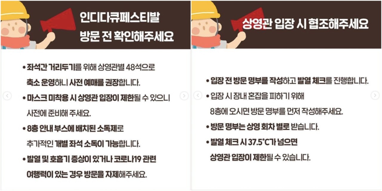그렇게 시간은 흘러 어느덧 3월 초가 되었고, 인디다큐페스티발 사무국으로부터 영화제 개최에 대한 안내메일을 받을 수 있었다. 3월 말에 개최하기로 되어있던 영화제 일정을 5월 말로 연기하겠다는 내용의 메일이었다. 상영감독으로서 최악의 상황을 생각해두고 있던 나에게는 안도감을 주는 소식이었다. 한편, 연기된 일정으로 인해 가뜩이나 바쁘게 업무를 처리하고 있을 사무국원들에게는 코로나19로 인해 되레 짐이 늘어났을 거라는 생각에 씁쓸한 마음이 들기도 했다. 그도 그럴 것이, 올해는 코로나19 감염 예방을 위해 인디다큐페스티발에 새로이 도입한 시스템들이 많았다.