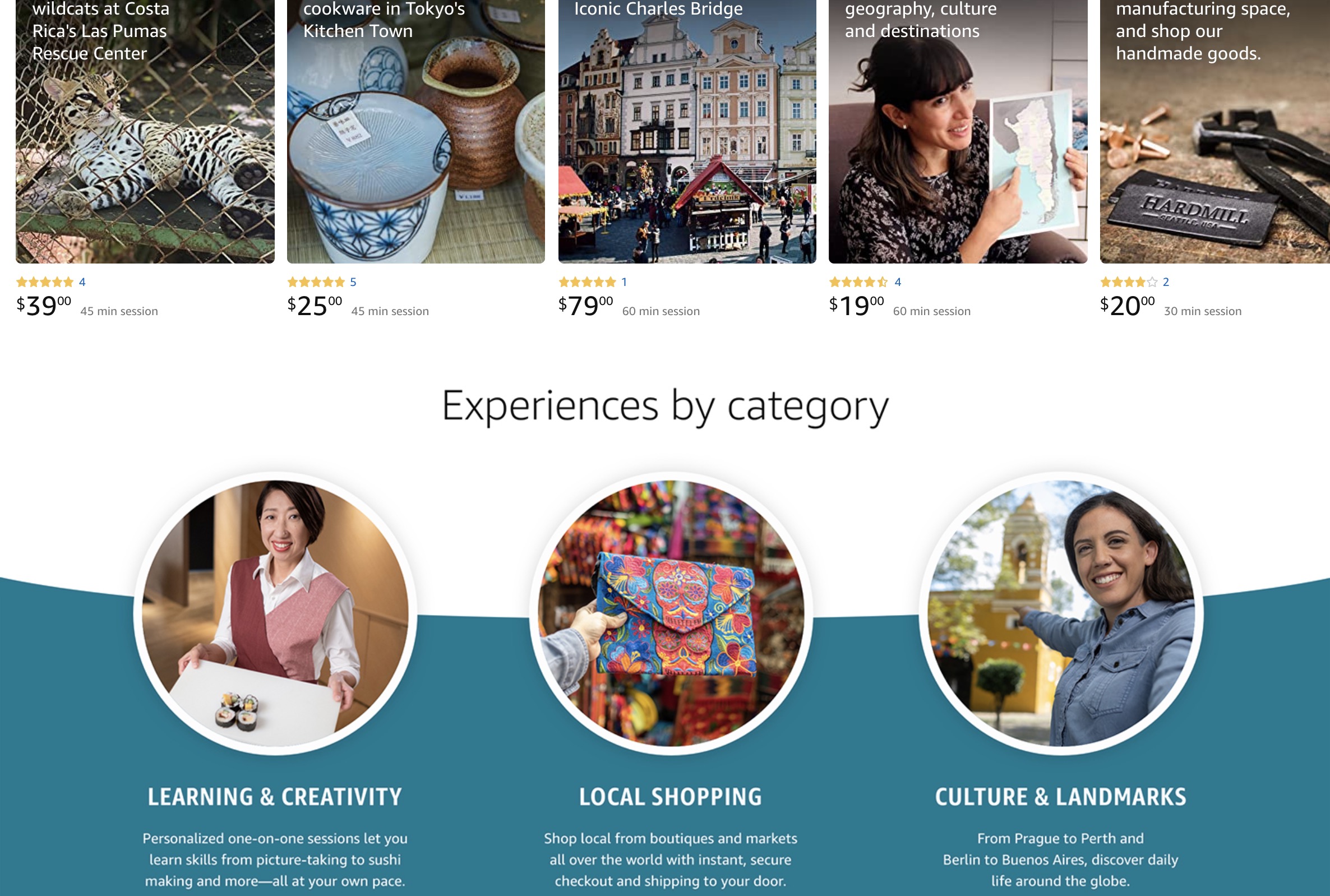 세계 최대 온라인 쇼핑 사이트인 아마존은 몇 달 전 여행과 쇼핑을 결합한 서비스 ‘아마존 익스플로어’(https://cutt.ly/3hSRhkD)를 공개했다. 홍보영상에 따르면 앞서 언급한 랜선 여행에서처럼 현지 가이드의 안내로 여행지를 둘러보다가 상점에 들어가면 물건을 둘러볼 수 있는데 이용자의 요구에 따라 가이드가 물건을 꼼꼼히 살펴본 뒤 그 자리에서 구매까지 할 수 있는 시스템으로 보인다. 라이브 커머스와의 차이점은 동시 시청자의 숫자다. 다수의 시청자를 대상으로 쇼핑 방송을 하는 라이브 커머스와는 달리 아마존의 서비스는 1인 내지는 소수의 이용자만 참여할 수 있는 방식이다. 아무리 인플루언서가 채팅창으로 시청자의 반응을 보고 물건을 살펴본다고 하더라도 음성으로 직접 말을 거는 아마존의 방식보다 나을 순 없을 테니 여행과 쇼핑을 한꺼번에 즐기고 싶은 방구석 여행자에게는 비싼 투어 참가비가 그리 부담스럽진 않을 것이다. □
