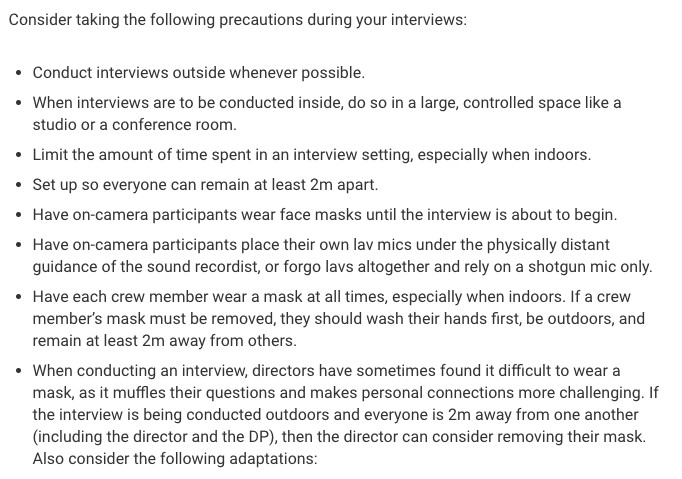 이에 더해, 다큐멘터리 제작을 위한 현실적 측면에 대한 이야기도 빼놓지 않는다. 가이드는 제작을 진행하고자 하는 지역의 공중보건, 모임규모, 마스크착용 등에 관한 규칙을 꼼꼼히 살펴볼 것을 권한다. 더 나아가 코로나19와 관련된 보험 커버리지, 코로나19가 가져올 제작 자금의 변화 등을 따져볼 필요가 있다고 말한다.