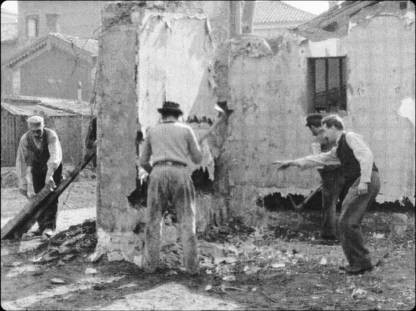 뤼미에르 형제의 <벽 철거(Démolition d'un mur)>(1896)입니다. 인부들이 남은 벽을 허물고 있습니다. 이내 벽이 허물어지자 영상이 거꾸로 재생돼 처음 시작했던 상태로 되돌아갑니다. 상영 당시에는 영사기 손잡이를 직접 역으로 돌렸을 것입니다.