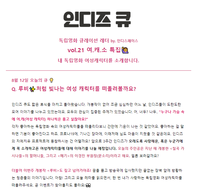 - ‘인디즈 큐’ 지난 호 보기 https://page.stibee.com/archives/58087