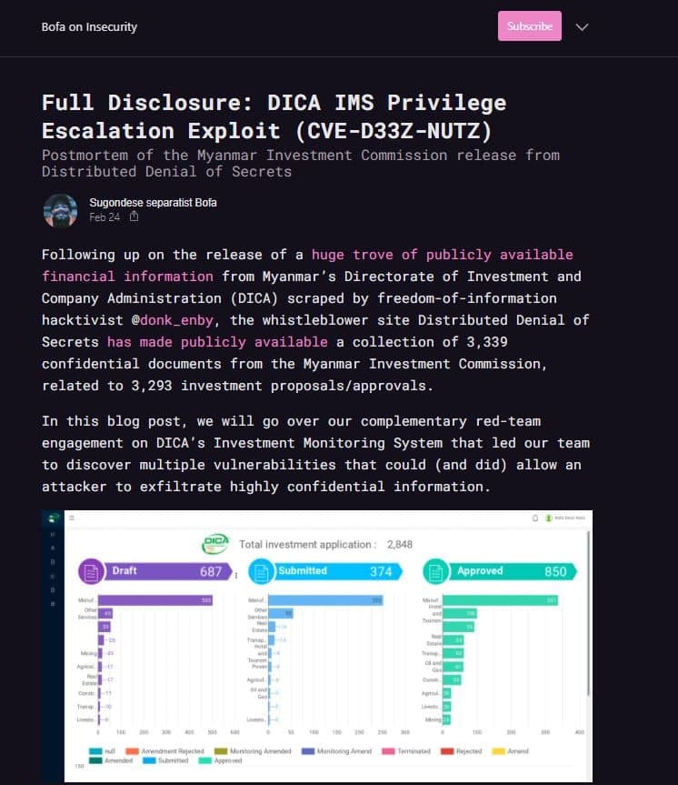 한편, 군부의 디지털 통제에 맞선 핵티비즘(hacktivism) 전술도 활발하다. 2월 6일, 미얀마 해커스라는 단체는 중앙은행, 미얀마 군부의 선전 페이지, 국영 방송사인 MRTV, 항만청, 식품의약품안전청 등 여러 정부 웹사이트를 공격했다. 또, 해커 @donk_enby는 미얀마 기업 소유구조와 관련된 330GB에 달하는 데이터와 미얀마 투자와 관련된 156GB의 데이터(3,293건)를 공개했다. 토렌트를 통해 다운로드할 수 있는 이 데이터는 각종 레지스트리 정보, 12만 개 기업과 관련된 문서와 임원들의 정보, 광산 및 채굴 산업에 대한 소유구조 정보, 그리고 타국 정부 및 해외 기업들의 미얀마 투자 관련 방대한 정보를 포함하고 있다. 이 해커는 군 내부 자료나 투자기업관리국(DICA) 서버를 해킹하였고, 이를 미얀마 군부의 악행들을 고발해온 NGO 단체 ‘미얀마를 위한 정의(Justice for Myanmar)’가 뉴욕타임즈 등 언론과 함께 분석하여 폭로했다.