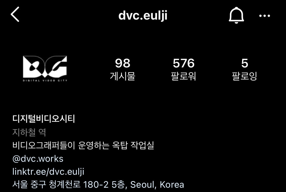 - 디지털비디오시티는 서울특별시 을지로4가역 청계천 앞 건물 5층에 위치한 작업공간입니다. 다섯 명의 영상 작업자가 모여 일을 하고, 모임도 하고, 쉬기도 합니다. 아, 참! 그리고 대관도 합니다. 스페이스클라우드에 검색해보세요. 청계천과 서울 야경이 내려다보이는 루프탑 보유!