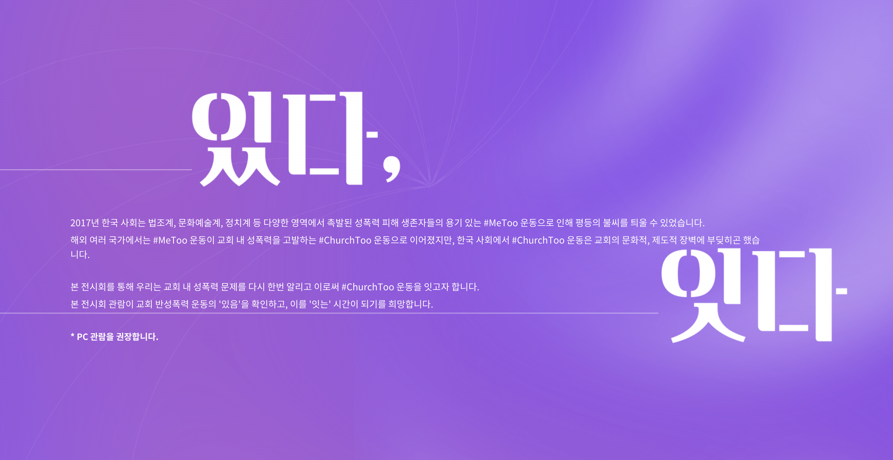 <#ChurchToo #있다 #잇다> 온라인 전시를 보며 기록의 힘을 다시 느낀다. <#ChurchToo #있다 #잇다>는 한국 교회에서 발생했던 성범죄를 촘촘히 정리했다. 전시회는 ‘교회와 성폭력’, ‘우리가 있다’, ‘우리가 잇다’의 3가지 섹션으로 구성됐다. 이를 통해 ‘한국 교회 속 권력에 의한 성폭력’의 구조적인 실체를 관람자가 인지할 수 있게 한다.