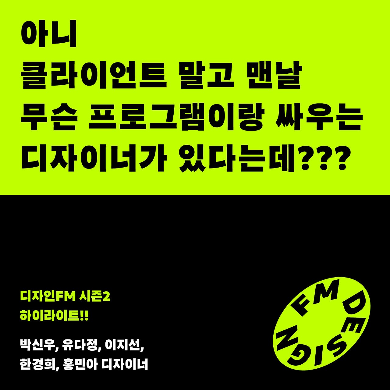 - 김수영: 디자인 FM 시즌 3 홍보…! 시즌 3은 협업을 주제로 다루고 있다 보니 누구든지 쉽게 들을 수 있는 팟캐스트라서 들어보시면 좋을 것 같습니다. 또 저희가 대표로 나왔지만 커뮤니티 안에 다양한 사람들이 있어서 이렇게 인터뷰만 보시면 정제된 이야기로 보이지만 활동하는 과정 중에는 정말 ‘우당탕탕’이에요. 저희도 당연히 힘든 과정도 많고 불편한 상황들도 있었어요. 그래서 너무 멋지게만 보시는 것보다 비판적으로 읽어주시면 감사하겠습니다.