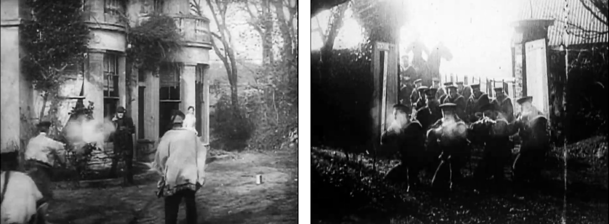 중국 의병대가 한 선교소를 침공합니다. 선교사의 가족들은 의병대를 이겨내지 못합니다. 여성과 아이들이 피신한 집안으로 의병들이 들이닥칠 때쯤 해군들이 나타나 중국 의병들을 제압합니다. 그런데 여기서 해군들의 모습이 정면으로 보입니다. 카메라의 방향이 바뀐 것입니다. 뿐만 아니라 카메라가 행위가 일어나고 있는 곳 한복판을 가로지르고 있습니다. 즉 시점 이동과 공간 분할이 일어난 것입니다. 이것은 1920년대에 들어서야 본격적으로 취해지는 편집 구성입니다.