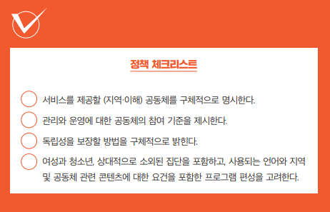 우선 ‘공동체’라디오에서 ‘공동체’를 어떻게 정의할 것인가이다. ‘공동체’는 무엇을 말하며, 어떤 방식으로 작동하고 운영이 되어야 할 것인지, 그리고 ‘공동체’라디오의 목표는 무엇인지에 대해 책은 정의한다. ‘공동체 방송국은 지방과 풀뿌리 단체, 소수자들의 목소리를 내보내고 정보 요구를 충족시켜주기 위해 그 계획과 기능을 특별히 맞췄다는 점’을 강조한다. 한국의 신규허가 과정에서 이런 내용이 얼마나 중요하게 다뤄지고 있는지는 잘 모르겠다. 우리가 공모를 준비하면서 공동체 방송에 대한 정의와 원칙에 대해 더 많은 시간을 할애해 토론하고 준비했던 것에 비해 정작 공모 과정에 들어간 이후로는 재정 능력에 대한 질문을 더 많이 받았던 기억이 있다. 물론 한국의 척박한 현실을 감안할 때 재정 능력에 대한 평가가 필요하다는 점은 동의하지만, 공동체 방송에 대한 정의와 원칙에 관한 토론이 거의 없었던 점은 아쉬운 지점이었다.