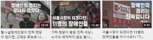 윤오) 탈시설장애인당에 조상지 후보님이라고 계세요. 저는 탈시설장애인당이라는 말만 듣고서 뭔가 확 매료가 되었거든요. 하라 가즈오의 다큐멘터리가 떠오르고 한국에도 이런 움직임이 있구나라는 생각에 그냥 그 이름에만 꽂혀서 찾아갔어요. 그 당시에 혜화에서 지하철 선전전을 하고 있었는데 조상지 후보님이 당시에 TTS(Text to Speech, 음성합성)로 연설을 하는 모습을 제가 봤는데... 모르겠어요. 제가 그걸 어떻게 규명해야 할지 모르지만 진짜 저는 그 순간에 많은 힘을 얻고 있다라는 생각이 많이 들었거든요. 그 사람이 이 공간에 존재함으로써 뭔가 균열을 내고 있다라는 감각을 제가 실시간으로 느끼게 된 게 기억에 남는 포인트였던 것 같아요.