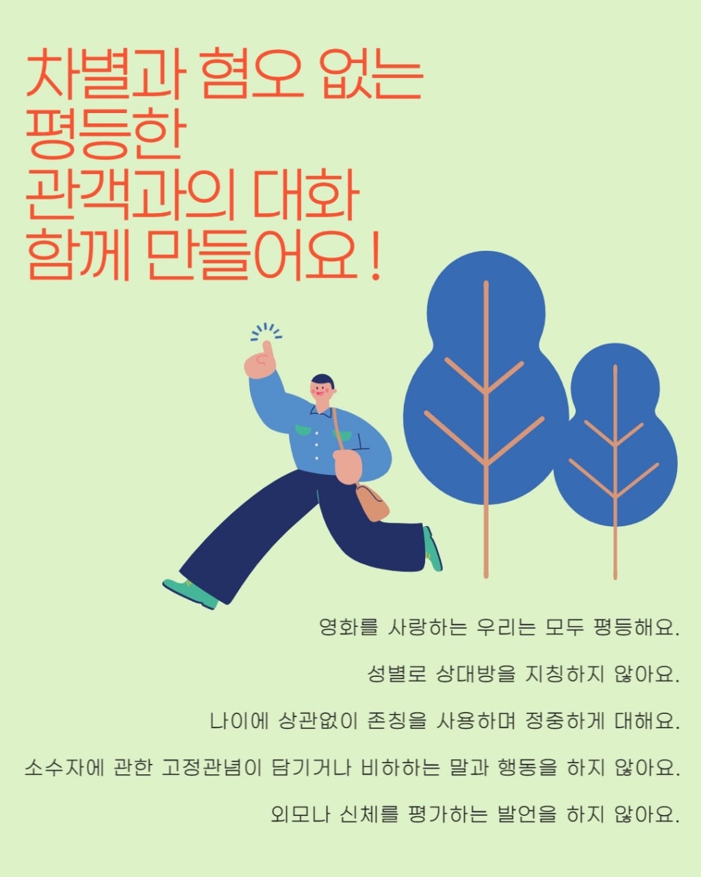 새롭게 만든 자료집처럼 긍정적인 변화가 두드러지지 않을 때도 있다. ‘좋은 관객과의 대화’가 무엇일지 궁리했지만, 내가 할 수 있는 일이 많지 않아 보였다. 관객과의 대화를 마치고 극장을 빠져나올 때, 공간의 분위기와 온도가 은근하게 바뀌었음을 느낄 때가 있다. 우리가 어떤 마음을 무사히 잘 나누어 가졌다는 걸 알게 하는 미묘한 움직임이 있다. 좋은 관객과의 대화 후에는 은근한 변화와 미묘한 움직임이 더 잘 보인다. 하지만 관객과의 대화에서 유익한 이야기가 오가고 마음을 나누는 건 쉬운 일이 아니다. 이 시간이 허투루 흩어지지 않고 잘 모일 수 방법을 알고 싶었다. 그 일환으로 ‘차별과 혐오 없는 평등한 관객과의 대화’ 캠페인을 기획했다. 감독과 모더레이터, 관객들까지 모두 함께 평등하고 안전한 공간을 만들자는 약속이다. 한국독립영화협회의 성평등한 환경을 위한 규약과 평등문화 약속문, 기타 영화제의 지침 등을 참고했고, 협회 내 성평등위원회와 결합해서 수정하거나 보완해야 할 부분이 없을지 논의했다.
