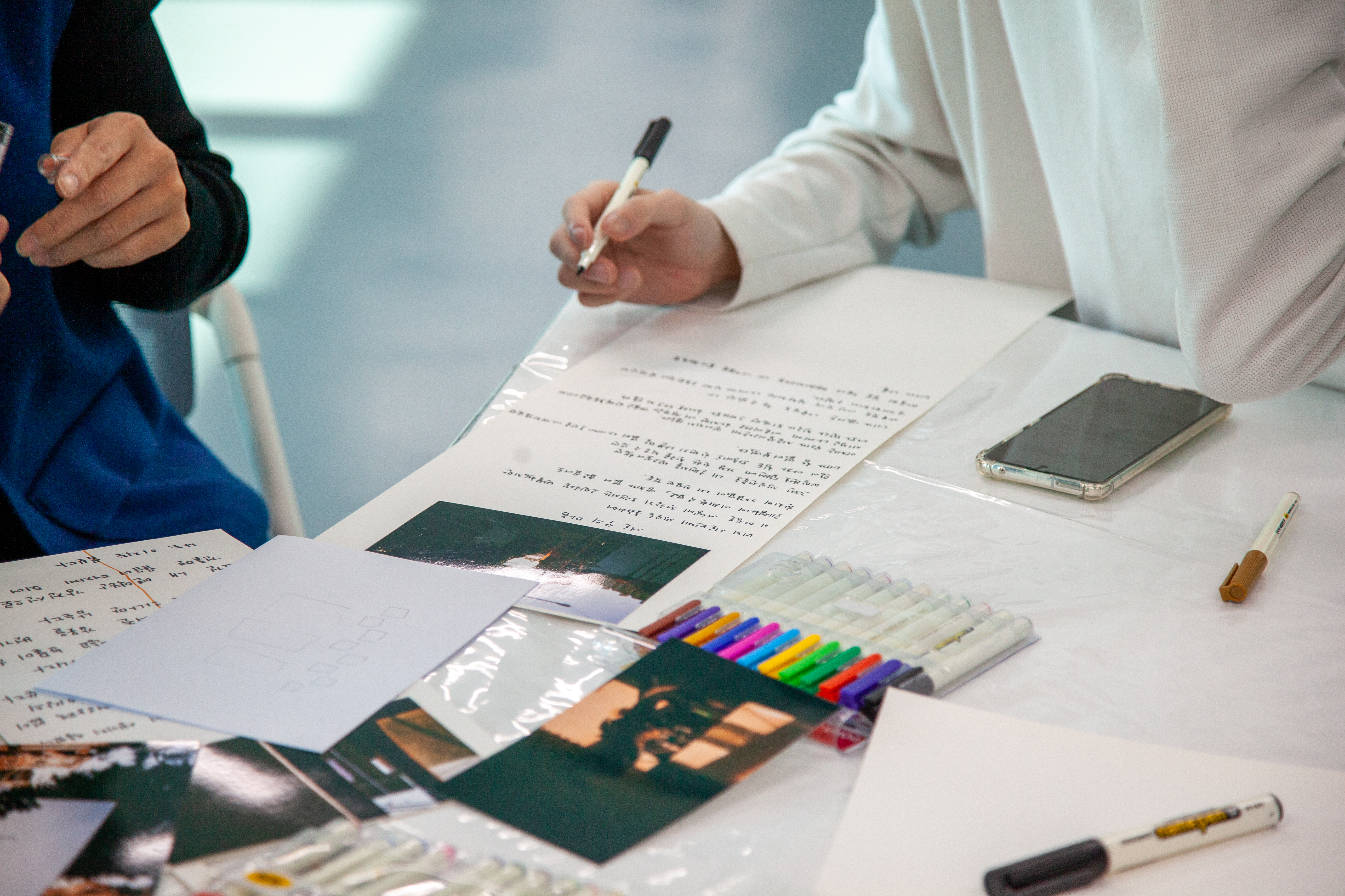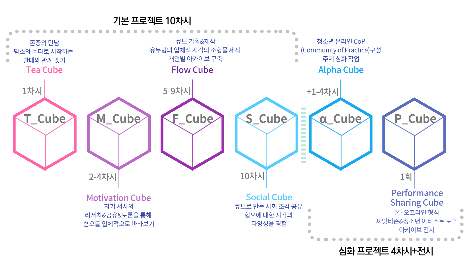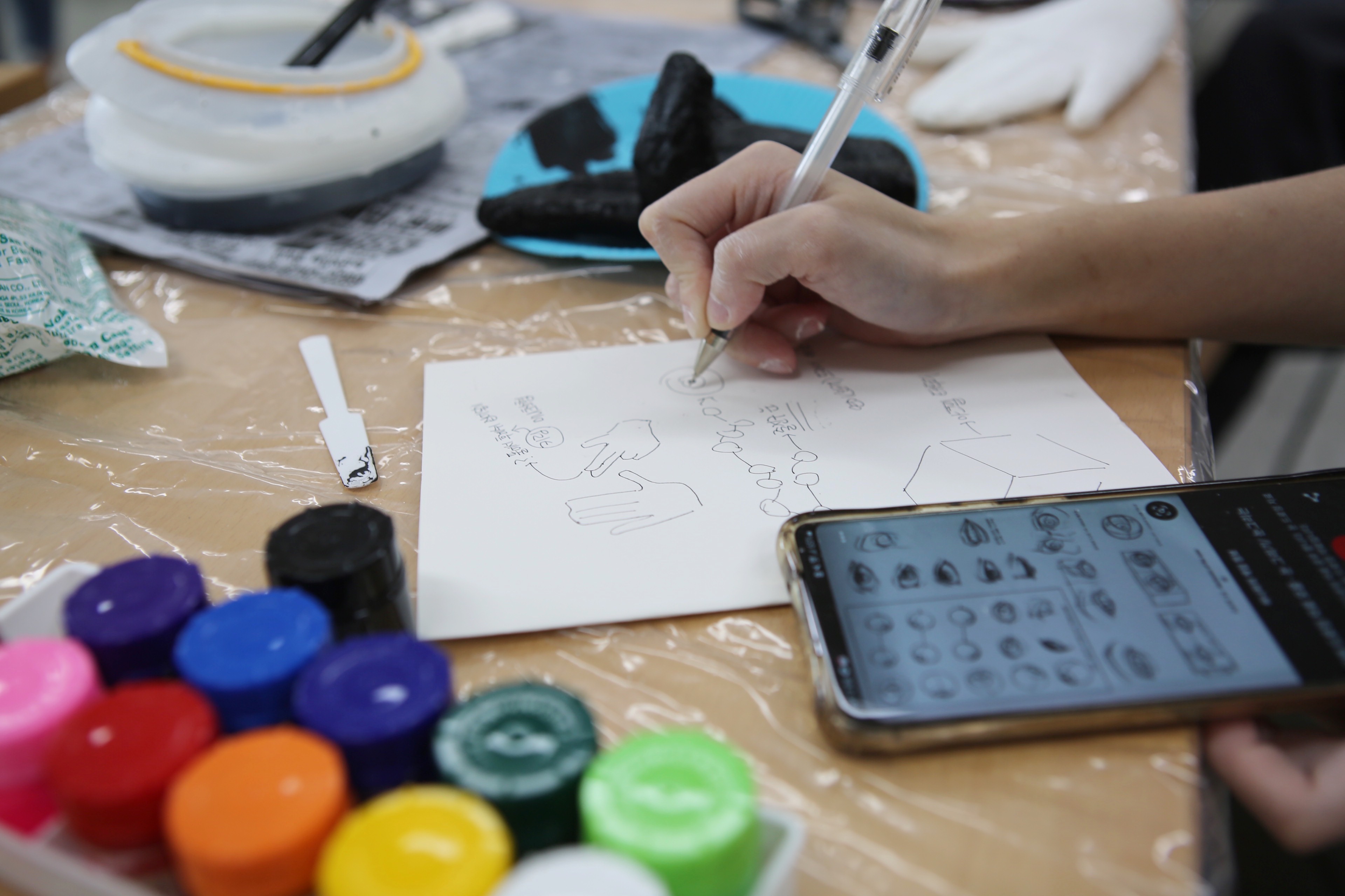 우리 프로젝트를 교육모델로 구성해보자면, 기본은 아이스브레이킹과 프로젝트에 대한 소개를 할 수 있는 1차시 진행, 이후 참여자가 직접 주제에 대해 리서치, 공유, 토론을 통해서 작품활동의 동기를 유발할 수 있는 2~4차시 진행, 그리고 함께 또는 각자의 작업에 몰입할 수 있는 5~9차시 진행 후 공유하는 10차시로 설계했다. 이후 심화 프로젝트를 통해서 작품과 주제를 심화할 수 있으며 더불어 많은 사람이 참여하여 과정과 생각을 공유할 수 있는 공유회(전시, 발표회 등)로 진행되었다. 이 기본적인 틀을 만들었지만, 문화예술교육의 현장은 생물과 같아서 항상 교육 현장, 참여자에 따라서 변수가 발생하며, 그 변수에 따라 유연하게 운영했다.