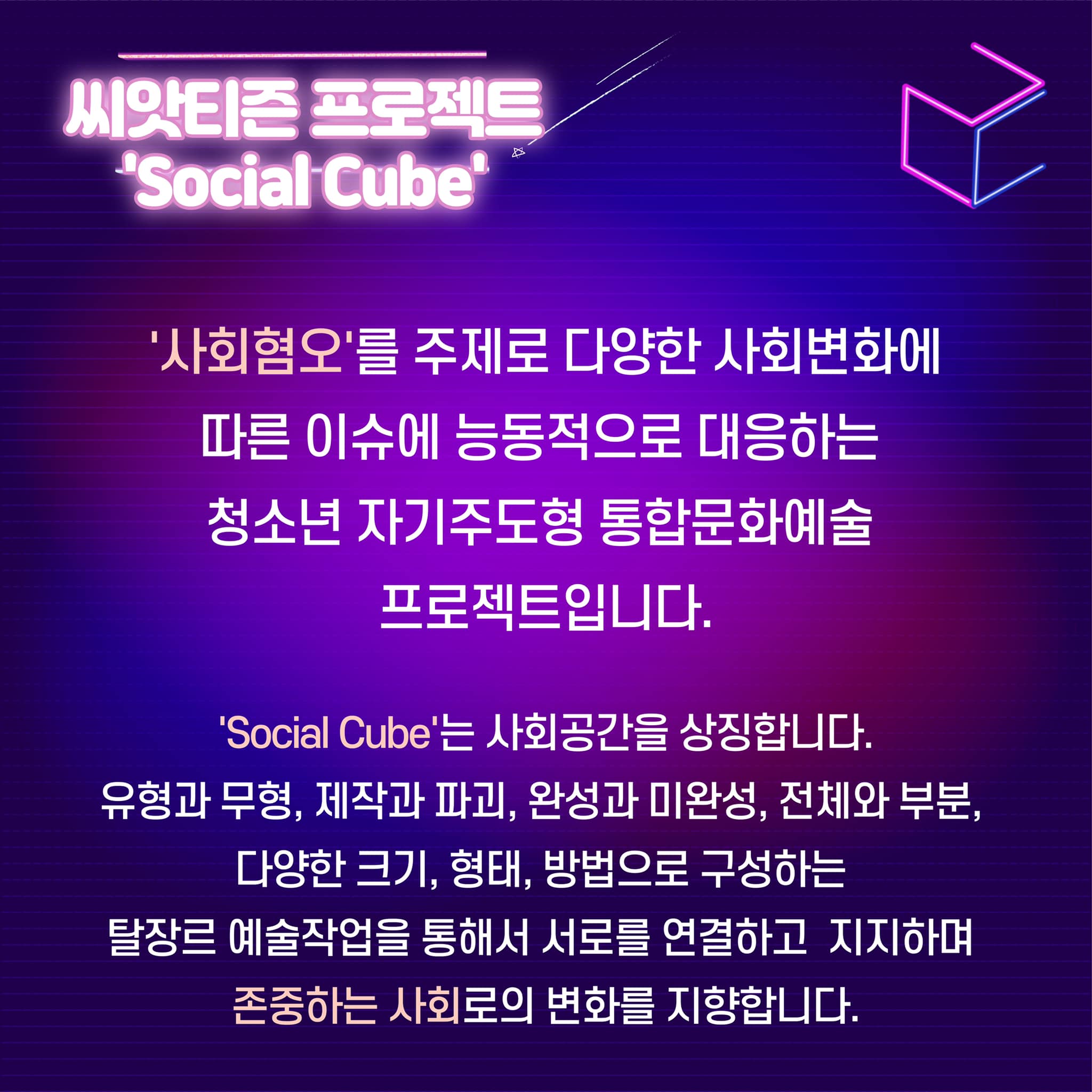 "씨앗티즌 프로젝트 ‘소셜 큐브(Social Cube)’는 사회의 일원으로서 개인의 경험과 관점으로 사회를 바라보고 예술을 매개로 발견하며 드러내고 싶은 무언가를 찾아가는 과정이다. 예술을 매개로 혐오에 대항하고자 하는 우리의 시도가 참여자 그룹 안에서 가능한가라는 의구심도 있었으나, 우리는 교육하지 않고 질문함으로써 참여자가 자기에게 다가서고 그것을 작업화하도록 하였다."