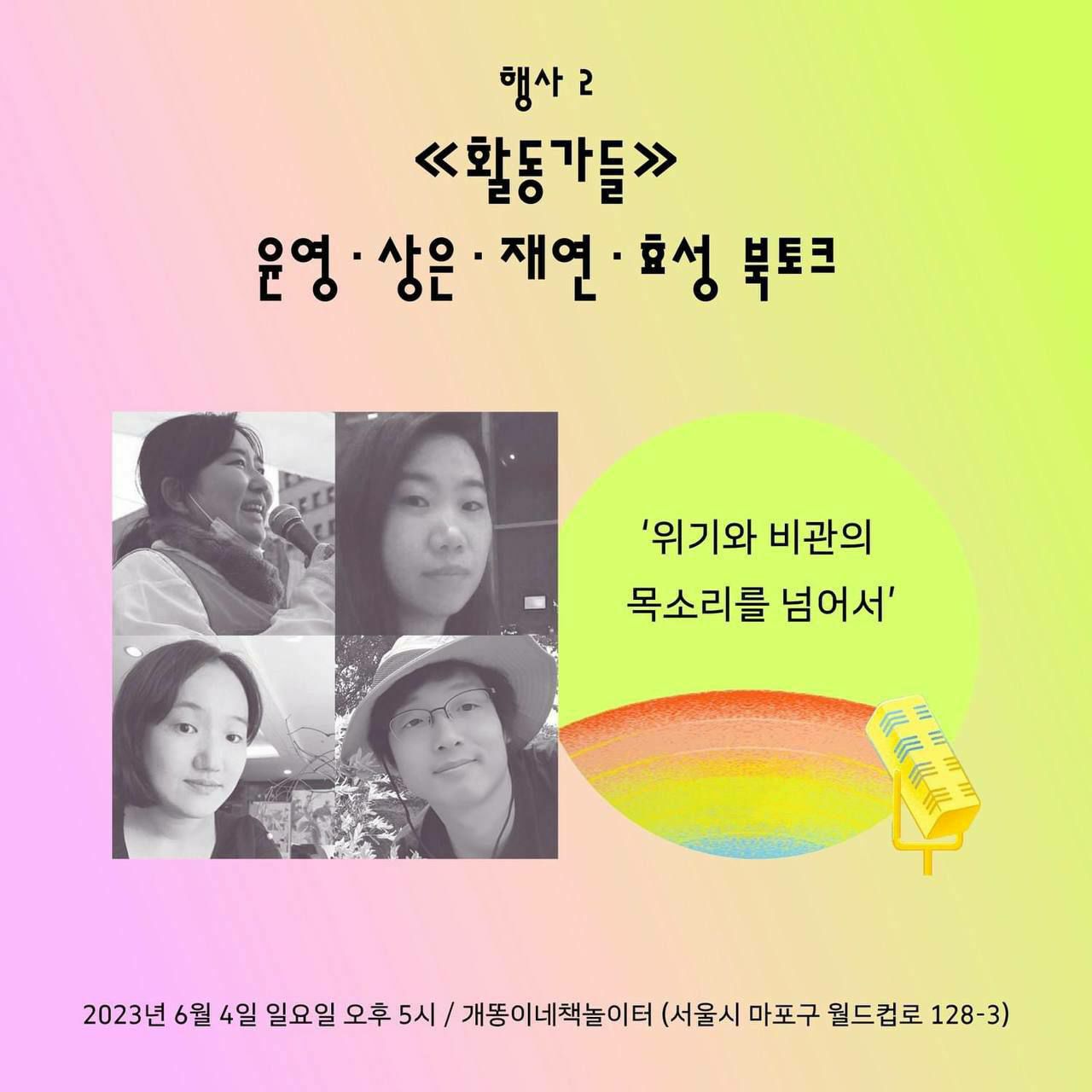 나는 2021년 한 해 동안 사회운동단체 플랫폼c’에서 돋움활동가로 일했다. 책 『활동가들』(2023, 빨간소금)은 당시 같이 활동가로 활동했던 보리, 그리고 내 후임으로 일했던 현빈 두 사람과 함께 플랫폼c 돋움활동가들의 전담사업으로 진행한 활동가 인터뷰 시리즈를 한데 모아 엮은 책이다. 노동, 정보공개, 반빈곤, 여성, 퀴어 등의 영역에서 활동하는 11명의 활동가들을 직업인의 관점에서, 또 생활인의 관점에서 인터뷰했다. 처음 기획은직업으로서의 사회운동가로 진로를 고민하는 이들을 더 많이 생기도록 하는 것에 주안점이 있었다. 그러나 『활동가들』이 나온 지금은 그에 더해서 자신이 있는 공간에서 나름의 방식으로 사회운동을 고민하는 누구나 읽었으면 하는 책으로 더 많은 욕심이 생기게 되었다. 이 글에서는 어떻게 『활동가들』이 기획되었는지에 대한 비하인드 스토리, 그리고 인터뷰의 핵심 질문 중 하나인 나에게 활동이란이라는 질문에 대해 나 자신의 답을 고민하는 과정을 담았다.