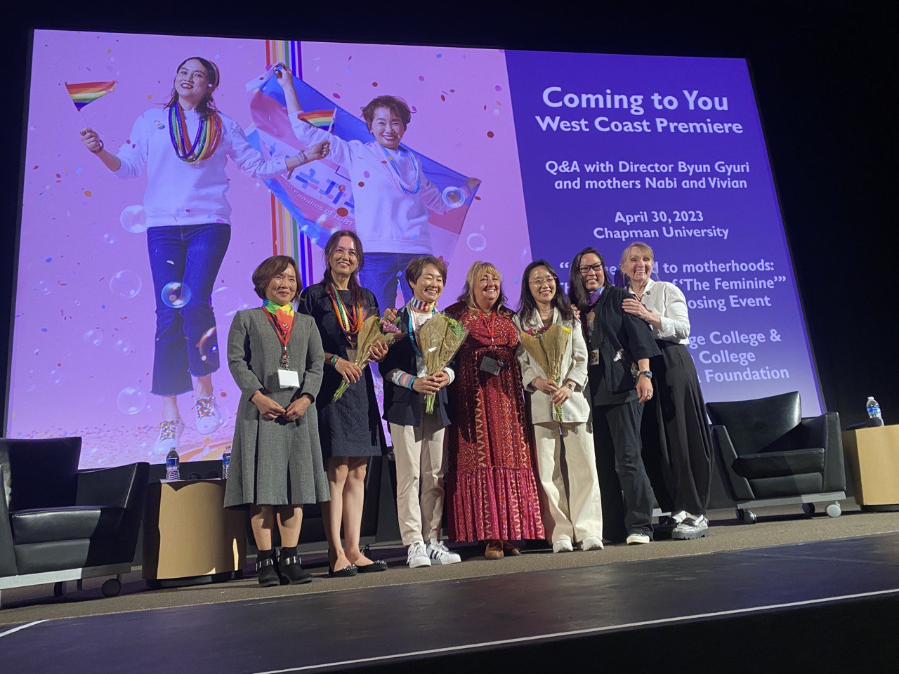 채프먼대학교 상영회 장소는 정말로 컸다. MARION KNOTT STUDIOS라는 학내 극장이었는데 상영 전날 극장을 방문했다가 극장 규모에 놀라 객석까지 신나게 뛰어 올라갔던 기억이 난다. 채프먼대에서 <너에게 가는 >팀을 초청하기 위해 거의 1 동안 펀딩을 준비하셨는데 극장을 채우기 위해 얼마나 많은 애를 쓰셨을까 많은 생각이 스쳤다. 영화는 만드는 사람, 출연하는 사람, 배급하는 사람도 있지만 영화를 함께 봐주는 관객분들이 있을 의미가 완성된다고 생각한다. 의미를 풍성하게 만들어 주신 미국 상영회 기획자분들께 다시 한번 감사했다. 채프먼 대학교 Q&A시간에서도 따뜻한 박수를 받으며 상영회를 마무리할 있었다. 나비님 비비안님은 긴장한 나와는 다르게 여전히 유려하셨고 관객 한분 한분과 따뜻한 인사를 나눠 주셨다. 매번 느끼지만, 분의 상영 활동에 대한 애정은 감복할 정도로 에너지틱하며 뜨겁다. 관객분들을 대하는 태도에 있어 나는 분께 배운 것이 정말 많다. 미국 상영회에서도 분의 힘은 넘치게 빛났다.