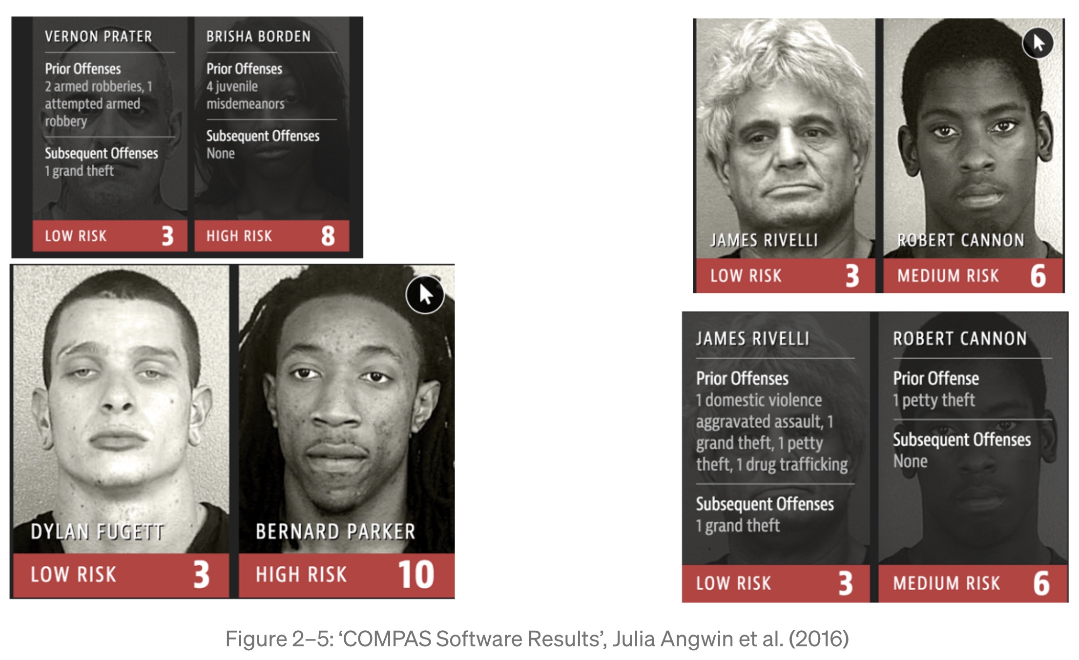 ▲ COMPAS 라는 범죄 예측 시스템의 편향성을 보여주는 사례.&nbsp; 전과자의 위험도를 측정하면서 저지른 범죄의 심각성보다 인종이 더 크게 반영된 결과가 나왔다.