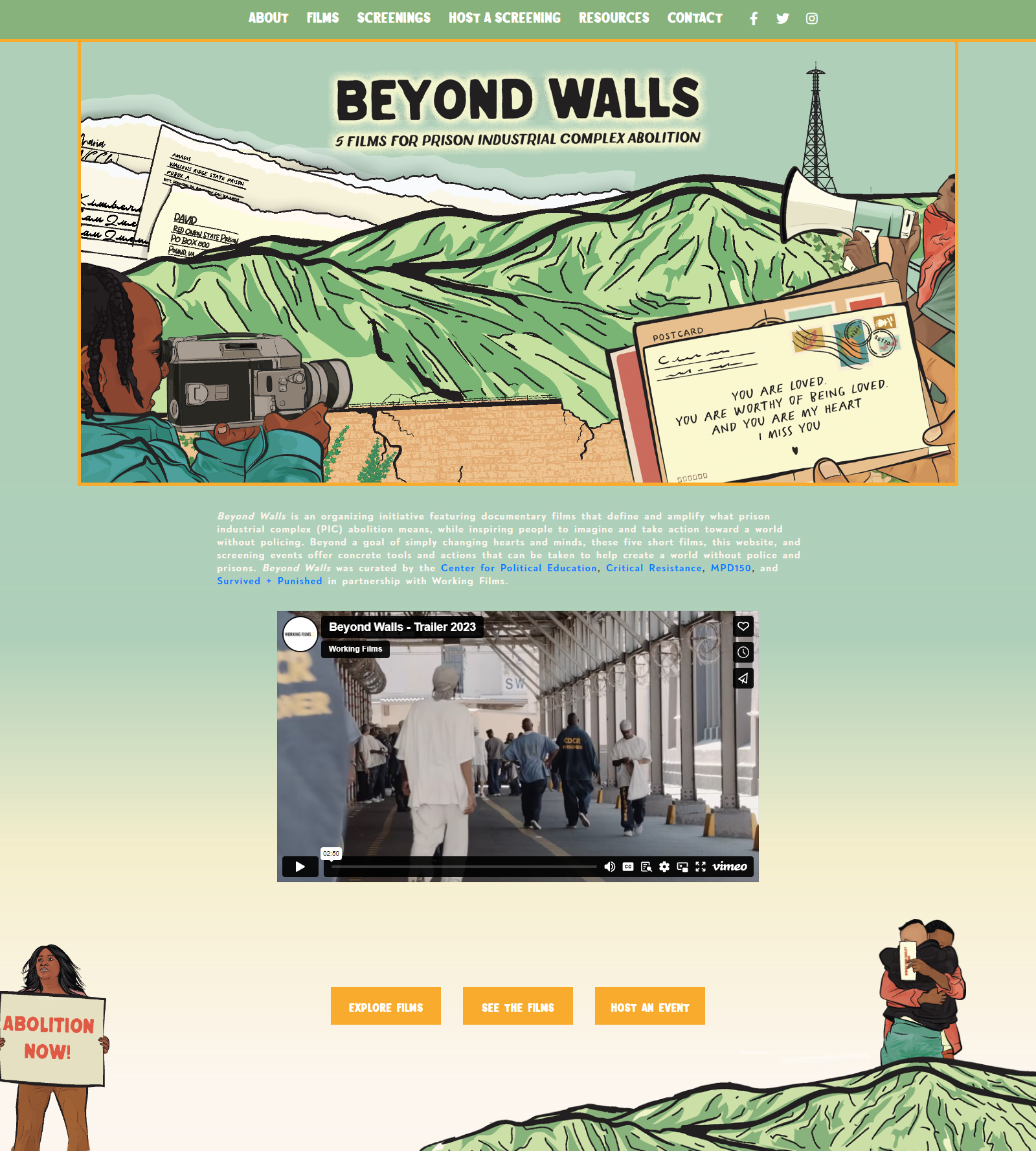 ▲ (좌) 교도소 내 산업단지 폐지 운동에 대한 5개 영화를 지원한 ‘Beyond Walls’ 프로젝트 사이트, (우) 기후 재난의 대비 및 회복과 무관하지 않은 사회적 불평등의 문제를 조명한 6개 영화를 지원한 ‘Revisioning Recovery’ 프로젝트 사이트. 홈페이지에서 주제 및 단편영화 소개, 진행 중인 상영 정보를 찾아볼 수 있으며, 상영회 주최 또한 신청할 수 있다.