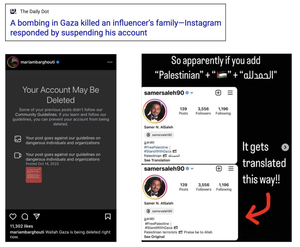 이와 같이 개인 SNS상에서 팔레스타인 지지 또는 이스라엘의 군사점령 종식을 촉구하는 게시글을 모두 명시적인 정치적 메시지로 해석하여 군경의 검열이 강화되는 가운데, 최근 메타(페이스북, 인스타그램 등)와 틱톡, 유튜브 등 소셜미디어 플랫폼 기업에서도 마찬가지로 팔레스타인을 지지하거나 이스라엘을 비판하는 게시물을 올리면 계정 정지 또는 게시물 노출을 의도적으로 줄이다 지적을 받은 바 있다. 메타는 지난 10월 20일 일부 팔레스타인 인스타그램 사용자의 프로필에 ‘테러리스트’ 라는 단어를 자동으로 표기해 온 것에 대해 사과한 바 있다. 또한 영어 단어 팔레스타인과 팔레스타인 깃발 이모티콘, '신께 찬양을'이라는 뜻의 아랍어 단어(alhamdulillah)가 표기된 인스타그램 사용자의 자기소개 문구를 영어로 자동 번역하니 "신께 찬양을, 팔레스타인 테러리스트들이 자유를 위해 싸우고 있다'고 자동으로 ‘테러리스트’가 함께 나왔는데, 메타는 왜 이런 일이 발생되었는지에 대한 답변은 하지 않았다. 여기에는 이스라엘 정부가 글로벌 IT기업에 공공연히 협조 요청을 해왔던 부분도 있는데, 2015년 11월 이스라엘 외교부장관은 구글, 유튜브 경영진을 만나 팔레스타인 관련 게시물을 감시 및 검열하는 것에 협조할 것을 촉구한 바 있다.