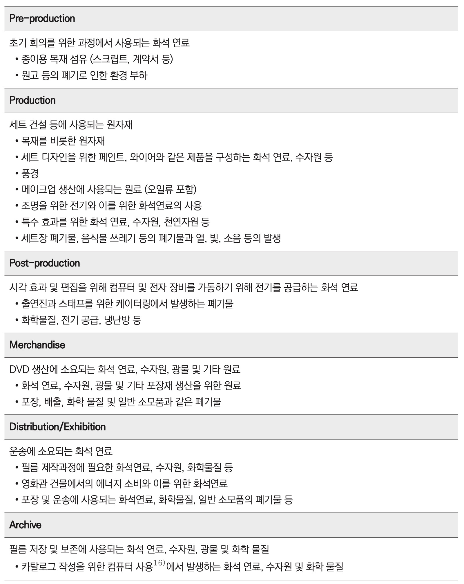 이 표는 캐나다의 ‘그린 스파크 그룹’이라는 컨설팅 회사가 프리 프로덕션부터 제작 단계별로 영화 산업이 어떤 환경적인 영향을 미치는지 정리한 내용입니다. 제일 많이 사용하는 건 전기 에너지와 화석 연료 사용으로 조명이 가장 많은 부분을 차지합니다. 세트 및 메이크업 등 원자재 소비가 많고 이 부분에서 폐기물이 가장 많이 나옵니다. 그리고 충격적인 부분은 촬영 현장에서 인위적인 생태 개입이 일어나는 일이 많다는 겁니다. 예를 들어, 눈 오는 장면을 찍기 위해 환경보호구역인 산에 소금을 뿌려 촬영 이후 생태계가 망가진 사건은 너무나 충격적이었습니다.