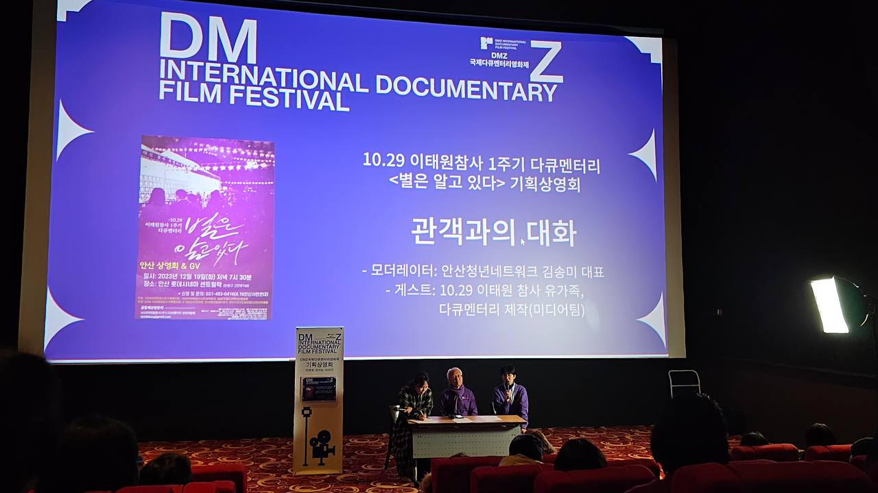 2024년 1월 6일 토요일, 서울 인디스페이스에서 10.29 이태원참사 1주기를 담은 <별은 알고 있다>의 마지막 순회 상영회가 진행되었다. 전국 순회 상영회는 10.29 이태원 참사 유가족 협의회와 10.29 이태원 참사 시민대책회의, 인디스페이스가 공동주최하였고 한국어 자막 및 수어 자막, 문자해설 자막을 갖췄다. 상영이 끝나고 제작진과 이태원 참사 유가족과의 대화가 진행되며 수어 통역도 제공되었다. 2023년 11월 21일에 출발한 <별을 알고 있다> 전국 순회 상영은 전국 18개 도시를 돌며 수백 명의 관객들과 함께 뜨거운 연대의 마음을 나눴다. 10.29 이태원 참사 1주기 다큐멘터리 〈별은 알고 있다〉를 제작한 권오연 감독과 빼갈 프로듀서를 만나 이야기를 나누었다.