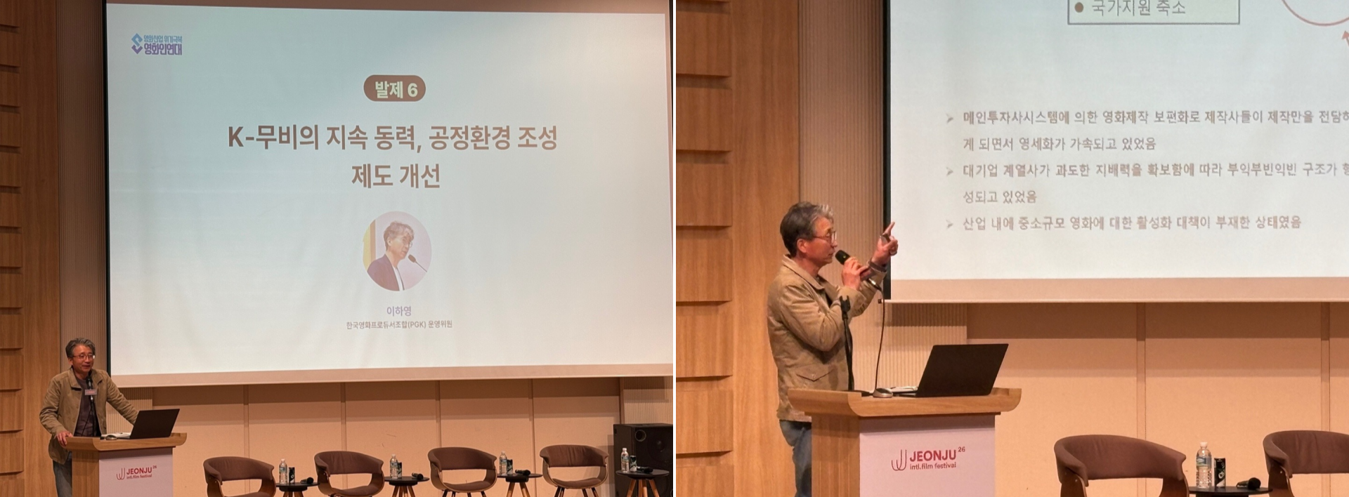 이하영 한국영화프로듀서조합(PGK) 운영위원은 한국영화 산업이 팬데믹 이후 관객 수, 투자, 제작의 동반 감소로 체력이 급격히 저하되었으며, 산업 전반의 불공정한 구조와 수직계열화가 위기를 심화시키고 있다고 진단했다. OTT의 부상에도 불구하고 수익 배분 구조의 불균형으로 제작사는 더 큰 어려움을 겪고 있으며, 메인 투자사 중심의 제작 구조는 중소 제작사의 영세화를 가속시키고 있다. 이에 따라 한국영화의 지속가능성을 위해 공정한 산업 환경 조성이 핵심 과제라고 강조하며, 과거 한국영화 동반성장 및 공정환경 조성 협의체의 사례를 바탕으로, 표준상영계약서 이행, 스크린 독과점 해소, 정보 투명화, 러닝개런티 공동 부담 등의 내용을 담은 공정경쟁 정책을 다시 활성화할 것을 제안했다. 또한, 불공정 행위에 대한 모니터링 체계와 정산 투명성, 스태프의 노동권 보호가 영화산업 신뢰 회복과 투자 활성화의 출발점이 되어야 함을 역설했다.