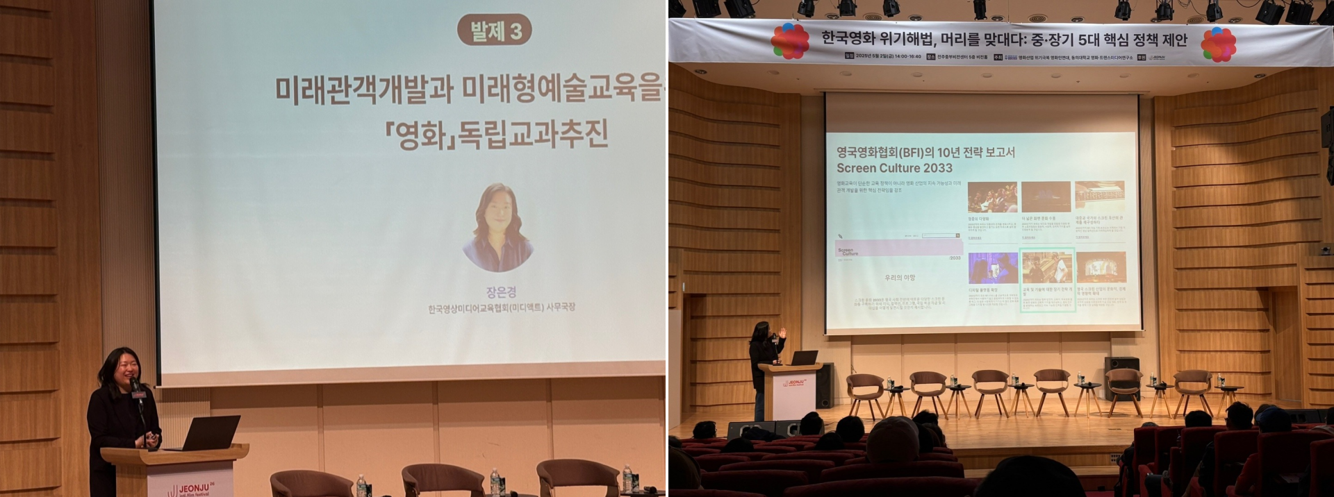 장은경 한국영상미디어교육협회(미디액트) 사무국장은 “영화라는 단어 자체가 사회에서 사라질 수 있다는 위기의식”을 포럼에 던졌다. 그는 영화가 단지 한 예술 장르가 아닌, 영상 시대의 문해력을 키우는 핵심 교육 도구라는 점을 강조하며, ‘영화의 공교육화’를 제안했다. 핵심 제안은 2028년 고등학교 선택과목으로 영화 과목을 정규 교과화하는 것이며 이를 위해 교사 양성, 교과서 개발, 법제도 기반 조성이 병행되어야 한다고 주장했다. 영국 BFI와 같은 사례를 인용하며 한국 역시 영상 기반 사회에 맞춘 교육 혁신이 필요하다고 역설했다. 특히 협회가 직접 운영 중인 ‘단체관람+영화인 특강’인 너랑봄 프로그램의 사례를 들며, 공교육 내 영화 경험이 학생들에게 어떤 의미를 갖는지 강조했다. 영상 리터러시의 격차는 계층에 따라 디지털 정보 접근의 불균형을 초래하며, 이는 단지 교육의 문제가 아니라 문화권과 표현권의 문제라고 짚었다.