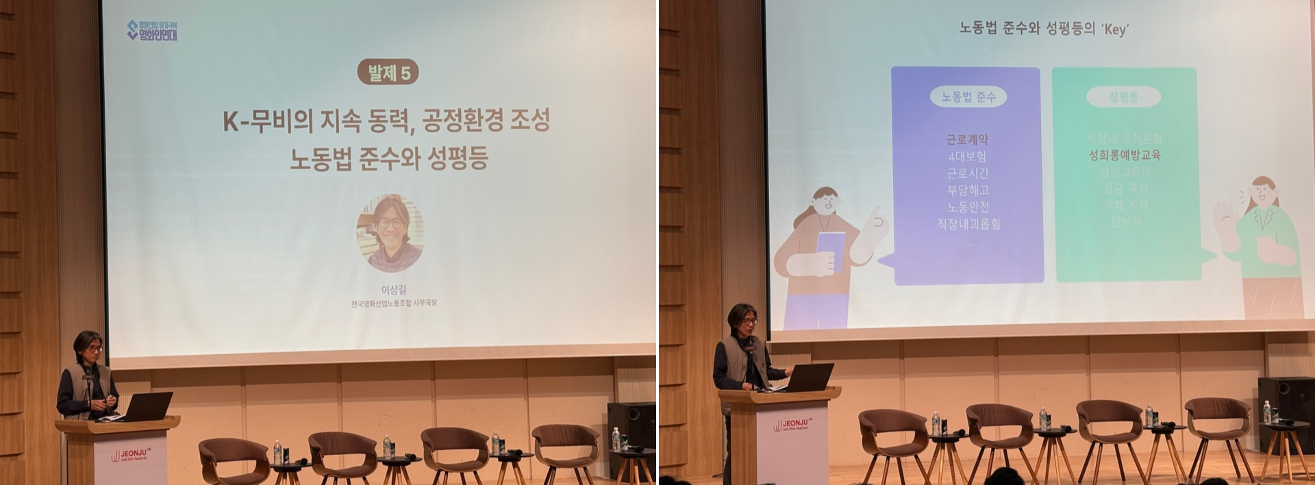 이상길 전국영화산업노동조합 사무국장은“K-무비의 지속 동력, 공정환경 조성”을 주제로, 현재 영화 및 OTT 시리즈 제작 환경에서 근로자-사업자 간의 근로계약 미체결, 장시간 노동, 성평등 교육 미이수 등 기본적인 노동권과 평등권이 침해되고 있는 현실을 지적하며, 이를 개선하지 않으면 산업의 지속 가능성이 위협받는다고 강조했다. 그는 특히 근로계약 체결과 4대보험 가입 등 법적 보호 장치가 유명무실화된 현장을 비판하며, 숙련 인력의 이탈과 계약관계 불균형이 심화되고 있음을 수치로 제시했다. 성희롱 예방교육 이수율이 급감하고 방송계 일부 관행이 영화 현장에 유입되며 조건이 퇴행하는 상황에서, 영화산업의 기초가 되는 ‘근로기준법’ 준수가 출발점임을 강조하고, 노사정 협력 아래 안전보건체계 구축과 표준보수지침 수립 등을 통해 공정한 제작환경을 조성해야 한다고 제안했다.