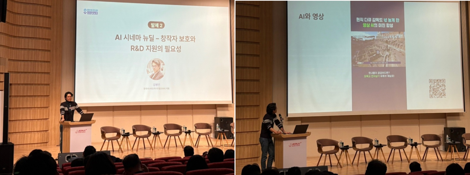 김병인 한국영화시나리오작가조합(SGK) 대표는 최근 창작자들 사이에서 뜨거운 이슈가 된 AI에 대해 “두려움과 기대가 교차하고 있지만, 결국 우리는 이 기술과 공진화할 수밖에 없다”는 입장을 내비쳤다. 그는 직접 구독료를 내고 AI 시나리오 도구를 사용한 경험을 공유하며, AI가 보여주는 높은 분석력과 빠른 피드백 속도, 냉철한 진단 능력에 주목했다. 동시에 AI의 한계로는 감정 없는 문장, 대체 불가능한 인간적 표현력의 부족, 그리고 학습에 사용된 기존 저작물에 대한 보상 부재 등을 꼽았다. 그는 향후 시나리오 단계에서 흥행 예측, 예산 추산, 프리 비주얼라이제이션, 후반작업 효율화까지 AI의 활용이 점차 확대될 것이라고 전망했다. 이를 위해 정부가 영상특화 AI를 개발하도록 지원하고, 창작자들이 AI를 창작 도구로 활용할 수 있는 실험 프로젝트를 적극 도입해야 한다고 제안했다. 아울러 AI 학습에 사용되는 저작물에 대해 유럽식 ‘사적복제 보상금’ 모델을 도입할 것을 제안하며, 창작자 권리를 보호하는 제도적 기반 마련을 촉구했다.