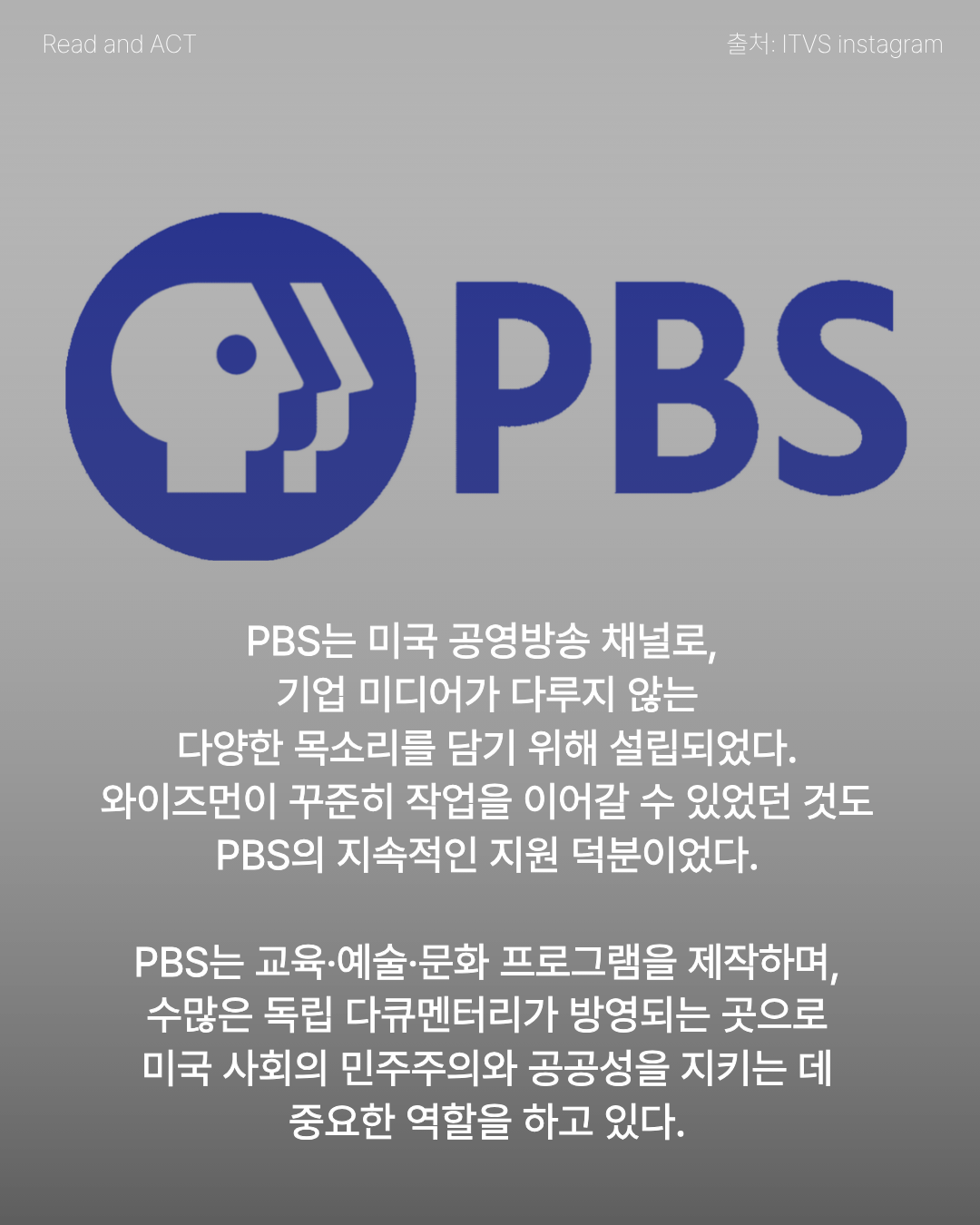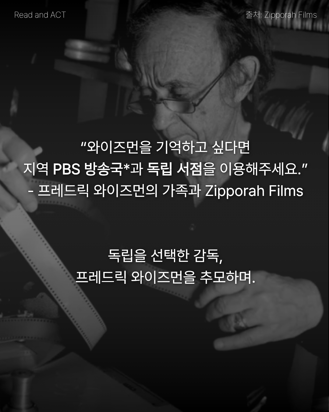 “와이즈먼을 기억하고 싶다면, 지역 PBS 방송국과 독립 서점을 이용해주세요.”
