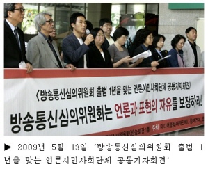 방송통신심의위원회, 위헌 폐지 주장까지 나와 방송통신심의위원회(이하 심의위원회) 출범 1주년. 심의위원회에 대한 시청자 국민들의 불만이 하늘을 찌른다. 심의위원회 활동에 대한 문제제기에 멈추지 않고 더 근원적으로 심의위원회 존립근거 자체가 위헌임을 제기하며 즉각 폐지를 주장하는 목소리까지 나오고 있다. 출범 1년이 조금 지난 심의위원회에 대한 국민들의 칭찬의 목소리는 어디서도 찾을 수 없다. “방송내용 심의를 통하여 방송의 공공성 ? 공정성을 제고하고 시청자들이 보다 고품격의 방송서비스를 누릴 수 있는 건전한 방송환경 조성에 기여(방송), 신속하고 공정한 심의를 통하여 온라인상의 불법 ? 유해정보 심의 및 시정요구를 실시하는 한편, 유통실태 조사, 사업자 ? 관계기관 간 공동대응 체계를 마련하는 등 불법 ? 유해정보 유통방지를 위한 다각적인 활동을 전개(통신)”(*주1)했다는 심의위원회 스스로의 평가에서만 찾을 수 있으니 참으로 민망한 일이 아닐 수 없다.심의위원회는 방송위원회 시절 “방송의 공정성 및 공공성을 심의”하던 데서 구 방송위원회와 정보통신윤리위원회가 분담하여 수행해 왔던 방송과 통신의 심의 업무를 통합, “방송 내용의 공공성 및 공정성을 보장하고 정보통신에서의 건전한 문화를 창달하며 정보통신의 올바른 이용환경 조성을 위하여 독립적으로 사무를 수행”(방송통신위원회의 설치 및 운영에 관한 법률 제 18조)하기 위하여 설치한 기구이다. 원래 설립 취지대로라면 심의위원회가 밝힌 대로 “방송내용 심의를 통하여 방송의 공공성, 공정성을 제고하고 시청자들이 보다 고품격의 방송서비스를 누릴 수 있는 건전한 방송환경 조성에 기여했어야 했다. 그러나 [방송통신위원회의 설치 및 운영에 관한 법률]이 제정, 공포된 2008년 2월 29일, 외형상으로 위원회는 설립되었지만 5월 15일 정식 출범 전까지 심의공백 상태가 지속되는 등 파행적 운영이 이어지고 있다. 2008년 이명박정권 출범과 함께 단행한 정부조직개편으로 방송과 통신의 주무기관이 방송통신위원회(이하 방통위)로 하나로 묶이면서 방통위가 대통령 직속 중앙행정기구화 하였다. 이로 인해 정부가 방송내용을 직접 통제하는 형식이 되어 검열로 작용할 수 있기 때문에 구 방송위원회의 심의기능을 분리하고 정보통신윤리위원회가 담당하던 통신심의를 통합하여 운영되게 된 것이 심의위원회라고 보면 된다. 조직 하나가 출범하면서 제대로 된 준비 없이 말 그대로 갑작스럽게 출범한 조직이 제대로 굴러간다면 오히려 그것이 이상한 것이다. 9인의 위원으로 구성되는 위원회는 위원 추천도 제대로 이뤄지지 않는 등 3개월이 되어서야 활동을 시작했다. 그러나 우려가 현실로 나타나는 데 까지 걸리는 시간은 그리 길지 않았다. 현재 그 피해는 고스란히 국민들이 보고 있다. 심의위원회의 심의결정이 언론과 표현의 자유를 침해하고 있다는 비판이 끊이지 않고 일어나는 것도 그 때문이다. 방송분야 심의, 정치심의와 불공정심의로 파행운영 방송 분야에서 심의위원회는 출범 1년 동안 ‘공공성 공정성 강화라는 이름으로 포장된, 정치심의와 불공정심의의 반복 결정'으로 파행을 거듭하는 등 수많은 비판에 직면, 폐지대상으로까지 거론되고 있다.MBC <PD수첩-미국산쇠고기 광우병에서 안전한가>에 대한 ‘시청자 사과', 지난 연말 사회적 합의는 고사하고 당내 논의조차 제대로 되지 않은 세칭 ‘미디어발전법'을 국회에 상정, 힘으로 강행처리하려 한 한나라당의 행태를 보도한 <뉴스후>에 대해서는 시청자사과, <시사매거진2580> <뉴스데스크>에는 각각 경고와 권고를 의결하였다. “사회적 쟁점이나 이해관계가 첨예하게 대립된 사안을 다룸에 있어서 공정성과 균형성을 유지하지 못한 것이 문제”로 방송심의규정 제9조 2항과 4항 즉, 공정성과 균형성을 위반했기 때문이라는 것이 결정의 근거였다. 대통령특보를 지낸 낙하산 사장을 반대하고 공정방송 수호를 위한 투쟁에 나선 YTN노조가 회사쪽 징계에 항의하는 의미로 검은색 옷차림으로 방송한 일명 ‘블랙투쟁'보도 결정도 마찬가지다. 지난해 11월 26일, 심의위원회는 이 방송과 관련 방송심의규정 제7조(방송의 공적책임)와 9조(공정성), 27조(품위유지) 조항에 위배된다며 ‘시청자사과'라는 중징계를 의결했다. 뉴스보도 프로그램에서 앵커, 기자의 옷차림이 문제가 되거나 일반 프로그램에서 선정적인 이유 외에 출연자의 옷차림이 문제가 돼 법정제재를 받은 첫 사례가 된 것이다. 그러나 ‘YTN과 공정방송을 생각하는 날‘을 맞아 지지차원에서 동일하게 검정색의상을 착용하고 방송한 MBC SBS에는 '문제없음‘ 결정을 했다. 같은 사안에 대해 “시청자에게 예의를 지켜야 하는데 이를 지키지 못했다”며 YTN에는 중징계를, 다른 방송사는 제재를 하지 않은 셈이다. 엄격하게 적용해야 할 규정을 자의적으로 적용하고 있다는 비판을 받을 수 밖에 없는 결정이다. 그러나 지난 연말 KBS의 “제야의 방송”에서 이명박 정부에 대한 반대의 목소리를 삭제하고 손팻말을 알아볼 없도록 영상처리하고, 현장에서 오세훈 서울시장 인터뷰 중
