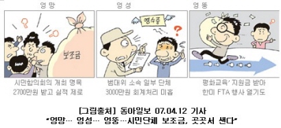 2) 보통 언론들은 이를 ‘보조금'이라고 표현하는데, 이는 정확한 표현이 아니다. 보조금 하면 단체 운영비를 보조하는 것 같고, 그를 받는 단체들은 ‘관변단체'같은 느낌을 주는데, 실제 시민사회단체들이 지원을 받는 것은 ‘보조금'이 아니라 정부나 지자체에서 공시하는 엄격한 기준에 따라 신청을 하고, 치열한 경쟁을 거쳐 선정된 ‘공익사업(프로젝트)'에 대한 지원금을 받는 것이므로 정확하게 ‘공익사업비'라고 불러야 한다.(정확한 법-행정적 용어는 ‘비영리민간단체 공익활동 지원비') 공익사업비는 단체 운영비로 전용할 수 없고, 오로지 선정된 그 공익사업을 수행하는 데 필요한 비용으로만 사용하게 되고, 이는 엄격한 감사 대상이기도 한다. 이런 공익사업비 수령을 관변단체인냥 몰아가는 수구언론들의 공격과 세간의 오해가 겹쳐져서 많은 시민사회단체들은 아예 정부와 지자체의 지원을 일체 거부하고 어렵게 자립의 길을 걷고 있다.