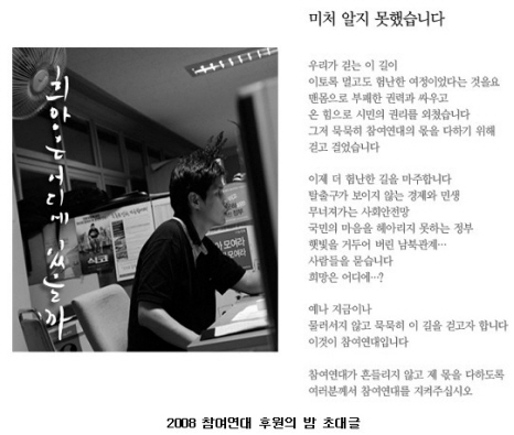 두 번째, 시민사회운동과 돈의 관계에 대해서도 곰곰이 생각해보게 된다. 시민사회운동을 전개할 때 가장 중요한 것은 민중과 시민들을 위한 열정, 좋은 사회를 만들기 위한 구체적 의제, 보다 더 공정하고 평화롭고 민주적인 사회를 만들기 위한 치열한 활동 등등이겠지만, 그 못지않게 지속가능한 시민사회운동을 위한 사람과 돈의 문제 역시 매우 중요하다는 것은 이제 누구나 알고 인정하는 사실이 됐다.