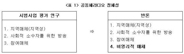 셋째, 공적지원 문제. 보고서는 자생적인 생존능력을 갖춘 사업자를 정규사업자로 전환한 후 한시적으로 지원하여 공동체라디오 산업의 안정적 기반을 마련해야 한다고 하고 있다.