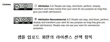 *주5: 샘플을 사용하지 않은 음악을 올리지 못하게 함으로써, ccMixter는 리믹스와 상관 없는 음악인들의 작품이 홍보 목적으로 업로드되는 것을 막고, 리믹스 사이트로서의 정체성을 지킨다. 하지만 조금 안타까운 건, ccMixter 내의 샘플이나 CCL을 이용하는 몇 개의 다른 사이트(Magnatune, Freesound 등)의 샘플을 하나라도 이용하지 않은 리믹스는 업로드할 수 없게 되어 있다는 것이다.