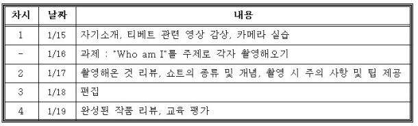 | 교육은 1월 15일부터 19일까지 총 4차시에 걸쳐 ‘Who am I Project'라는 이름으로 진행되었다. 짧은 기간이었기 때문에 다른 것보다 자신에 대해 이야기하는 것이 좋겠다는 판단이 있었고, 우리 역시 활동가들에 대해 아는 것이 필요했기 때문이었다. |