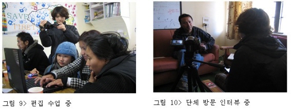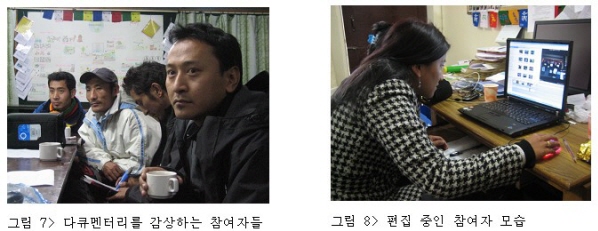 | 참여자들은 모두 하나같이 진지하고 열정적이었다. 활동가들이기 때문에 이런 간단한 프로그램에 실망하지는 않을까 걱정을 하기도 했는데, 다들 비디오카메라로 촬영해보는 것은 처음이라면서 ‘당신들한테는 사소한 것일지 몰라도 우리에게는 그 작은 것 하나 하나가 모두 새롭고 흥분되는 경험'이라며 눈을 빛냈다. 편집수업을 할 때도 아침 10시부터 밤 10시까지 모르는 것을 하나하나 물어가며 자신들의 작품을 자신들의 손으로 직접 완성하였다. 참여자들이 만든 작품에는 자신이 활동하고 있는 단체의 소개와 티베트의 독립에 대한 염원, 티베트 여성으로서 느끼는 여러 가지 것들, 망명지 인도에서의 새로운 생활과 고향으로 돌아가고 싶은 간절한 마음 등이 담겨져 있었다. 그리고 마지막 수업 시간. 다 함께 만든 작품을 보고 난 후, 이번 교육 과정에 대한 평가를 함께 하는 시간을 가졌다. 거의 대부분의 참여자들이 교육에 대해 모두 긍정적인 이야기를 해주었다. 영상 미디어가 얼마나 중요한지 알고도 있고 배우고도 싶었지만 그럴 기회가 없었던 그들에게 너무나 좋은 기회였다는 것이다. 하지만 이번 교육은 너무 짧아 아쉽다면서 다음에는 더 길게, 충분한 장비를 가지고 했으면 좋겠다는 의견, 촬영이나 편집과 관련되어 정리된 교재가 있으면 좋겠다는 의견, 더 많은 사람들이 참여할 수 있었으면 좋겠다는 의견 등 다음에 정식으로 진행될 프로젝트를 위한 의견들을 아끼지 않고 내주었다. 그리고 꼭 다음 프로젝트에 참여하고 싶다면서 준비할 때 도울 것이 있으면 언제든 연락을 달라는 당부도 빼놓지 않았다. 여러모로 부족했던 짧은 교육은 열정적인 참여자들 덕분에 나름 성공적으로 마무리가 되었다. 하지만 기금 지원을 받지 못해 프로젝트의 실현 여부가 불투명해진 상태에서 일단 ‘물꼬라도 트자'고 조금은 무리해서 진행한 교육은 성과도 있었지만 분명히 한계도 있었다. 성과라고 한다면, 현지 사정을 정확하게 알지 못한 상태에서 ‘사전 답사' 개념의 과정을 진행한 덕분에 현지의 여러 제반 사항, 단체들의 사정 및 활동가들의 교육에 대한 욕구, 교육을 연계하여 함께 진행할 수 있는 인력의 발견까지 많은 것들을 새롭게 알고 확인할 수 있었다는 점을 꼽을 수 있을 것 같다. 하지만 이후 진행될 본 프로젝트에 대한 계획과 그 계획을 실행할 수 있는 인력 및 기금에 대한 준비가 이루어지지 않은 상태에서 진행된 ‘사전 답사' 와 ‘사전 교육'이었다는 점이 가장 큰 한계이기도 하다. |
