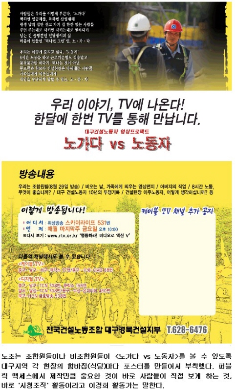 RTV 말고도 대구에 있는 케이블 방송국과도 이야기가 되어서, ‘노가다 vs 노동자'를 방송하고 있는 곳이 있어요. 처음에 케이블 방송국에 방영을 부탁하기 위해서, 미디어센터를 통해서 대구경북케이블방송협회에 제안하는 과정에 있어요. 대구의 모든 케이블 방송국이 모여서 하는 편성 회의에 ‘노가다 vs 노동자'의 방영 문제를 안건으로 올려달라고 부탁을 하려고요. 이 영상물을 더 많은 조합원들이 보게 하려면, 각 방송국이 개별적으로 판단하면 안 된다는 생각이 들었거든요. 그래서 방송 지역과 시간에 대한 구체적인 기획안을 만들어서 줬는데, 아직은 이런 저런 사정 때문에 회의 안건으로 올라가는 게 미뤄지고 있어요. 지금 현재는 미디어센터에서 조정을 해줘서, TCN에서는 이미 방영을 하고 있고, 수성 동구 케이블에서는 다음 달에 시작을 한다고 해요.