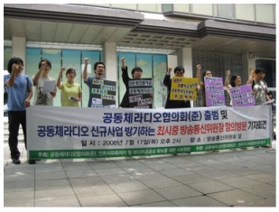전국 각지에서 공동체라디오를 준비하고 있는 지역단체들이 그동안의 개별적 활동에서 벗어나 협의회를 구성하였다. 공동체라디오 운동에 새로운 움직임이 시작된 것이다. 협의회는 지난 7월 17일 방송통신위원회 앞에서 공동체라디오 협의회 출범 및 공동체라디오 신규 사업을 방기하는 최시중 방송통신위원장 항의방문 기자회견을 개최하고 공동체라디오 정규사업 실시와 활성화를 위한 공동대응에 나섰다. 방통위원장과의 면담은 입구를 둘러싼 전경에 의해 이루어지지 않았다. 잘 알다시피 공동체라디오는 기초자치지역을 권역으로 하여 방송활동을 수행하고 있는 참여 매체이다. 2005년 4월부터 전국 8곳의 시범사업자들이 방송을 수행하고 있으며, 공동체라디오는 시범사업 3년 동안 지역공동체 활성화와 지방자치에 기여해왔다. 또한 지역민들이 방송에 직접 참여하면서 지역민들의 목소리를 대변해왔고, 사회에서 소외 받는 사람들이 자기의 목소리를 낼 수 있는 기회를 보장하는 등 공동체라디오의 도입 취지를 성공적으로 수행해 온 것으로 평가받고 있다. 이에 많은 지역에서는 공동체라디오의 취지에 공감하고 짧게는 1년에서 길게는 3년여 동안 공동체라디오를 준비해 왔다. 그러던 중 지난 2007년 11월 29일, 공동체 라디오 방송의 정책방안과 사업추진 일정이 제시되었다. 물론 이 과정에서 공동체라디오를 추진하고 싶은 지역에서 스스로 가용 주파수를 찾아오라는 정말 어이없는 주문이 있었다. 하지만 공동체라디오를 준비하는 지역에서는 공동체라디오에 대한 의의와 희망을 잘 알고 있었기에, 자비를 들여 주파수 신청을 할 수밖에 없었다. 그런데 한 달이면 나온다던 주파수 결과는 현재 감감 무소식이다. 담당부서에 전화를 하면 결과가 곧 나온다, 지금 검토 중이다 하고 차일피일 하더니, 최근에는 서류를 검토해보지도, 검토할 시간도 없다는 얘기가 흘러나왔다.한데 정말 어처구니없는 소식을 듣게 되었다. 취임 전부터 영어사랑을 공고히 했던 대통령의 의지가 있어서인지, 방송통신위원회는 대통령의 “영어FM 실시”라는 말 한마디에 없다던 주파수를 만들어냈다. 그동안 공동체라디오 출력증강과 신규 사업 요구에 주파수가 없다는 말을 되풀이 하더니 정권이 바뀌자마자 어디선가 주파수가 “짠”하고 나타났단 말인가? 게다가 주파수를 찾기 위해 방송발전기금운용계획을 변경하면서까지 11억 원이나 되는 거금을 들여 마련했다는 것이다. 또한 불과 10w(와트) 이상으로 출력을 높여달라는 공동체라디오의 요구에는 그토록 인색하던 방통위원회가, 영어FM을 위해서는 현재 공동체라디오 1w의 1000배에 이르는 1kw의 출력을 보장하고 있다. 현재 영어 FM은 지난 7월 3일 수도권 신규 영어FM 사업자로 서울특별시를 선정했고 올 연말이면 본 방송을 실시한다고 한다. 부산과, 광주는 영어FM사업을 위한 재단법인 설립절차를 진행 중이며 9월중 허가신청서를 제출할 예정이라고 한다. 방통위가 지난 5월 2일 비공개 회의를 개최하고 영어 FM 개국을 위한 기본 계획을 심의·의결한지 2개월여 만에 그리고 5월 30일 영어FM 심사기준 확정, 1개월만의 일이다. 기본 계획 수립에서 사업자 선정까지 두 달 만에 그야말로 일사천리로 진행됐다. 지난 3년여 동안의 공동체라디오 진행과정과 너무나 극명한 대조다. 수차례 토론회와 사회적 공론화를 거쳤던 공동체라디오와 달리 공표자료도 없이 단 한 번의 비공개 회의를 통해 결정을 내린 그야말로 독단적 행위이다. 이에 전국에서 공동체라디오 방송을 준비해 온 시민사회단체와 전국미디어운동네트워크 등 미디어 운동단체는 지난 6월 12일 오후 서울 종로구 방송통신위원회 앞에서 정규사업 실시를 촉구하는 기자회견을 가졌다. 기자회견 후 간담회 자리에서 공동체라디오 신규 사업 준비 협의체를 구성할 필요가 있다는 의견이 제기되었다. 공동체라디오 정규사업이 지연되고 있는 상황에서 방통위와 신규사업자들과의 공식적 채널 자체가 기존의 시범사업자 중심의 협의체인 커라협(한국커뮤니티라디오방송협의회) 이외에 없다는 것과 신규 사업을 준비하는 주체들이 함께 얘기하고 함께 대응하기 위한 구심점이 필요했기 때문이다. 그리하여 6월 19일 공동체라디오 신규 사업 준비 협의체 구성이 제안되었다. 이 과정에서 정말 많은 지역에서 공동체라디오에 대한 열망을 읽을 수 있었으며 적극적으로 협의회에 참여하겠다는 의사를 밝혔다. 이후 6월 26일 전주에서 공동체라디오 신규사업자 협의체 구성을 위한 긴급토론회가 열렸다. 이 자리에서 공동체라디오 협의회 구성을 결의하고 공동체라디오 정규사업 추진을 위한 방통위 항의방문과 법적대응, 국회와의 연대 등을 추진하기로 했으며 단순히 공동체라디오 신규 사업 추진을 위한 활동이 아니라 공동체라디오의 조기 시행과 정책관련 사항 그리고 공동체라디오의 대중적 확산을 위한 노력도 함께 전개하기로 했다. 그러나 지난 방통위원회 항의 방문에도 불구하고 지금까지 공개서한에 대한 답변은 이루어지지 않고 있다. 오히려 지난 14일 방통위원회는 지난 3년간 진행돼 온 공동체라디오 시범